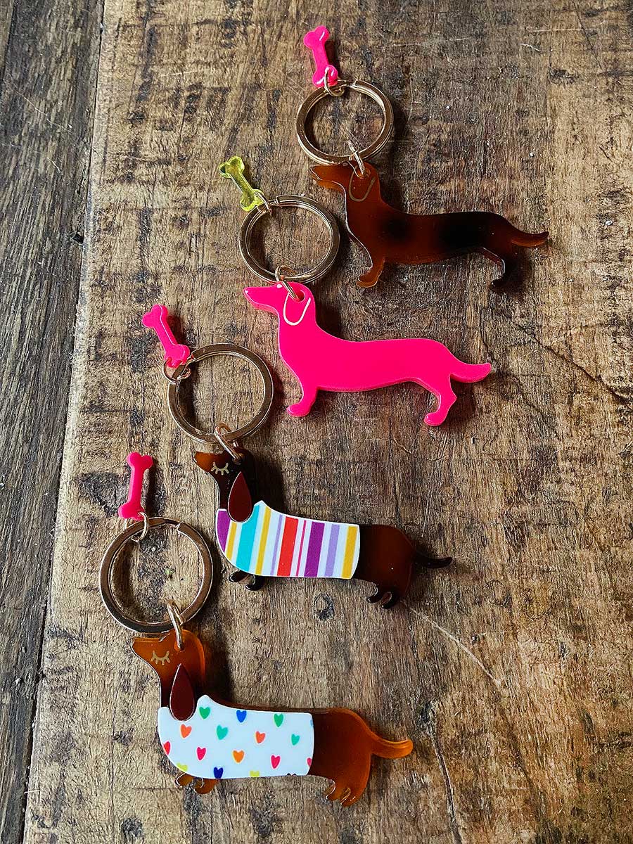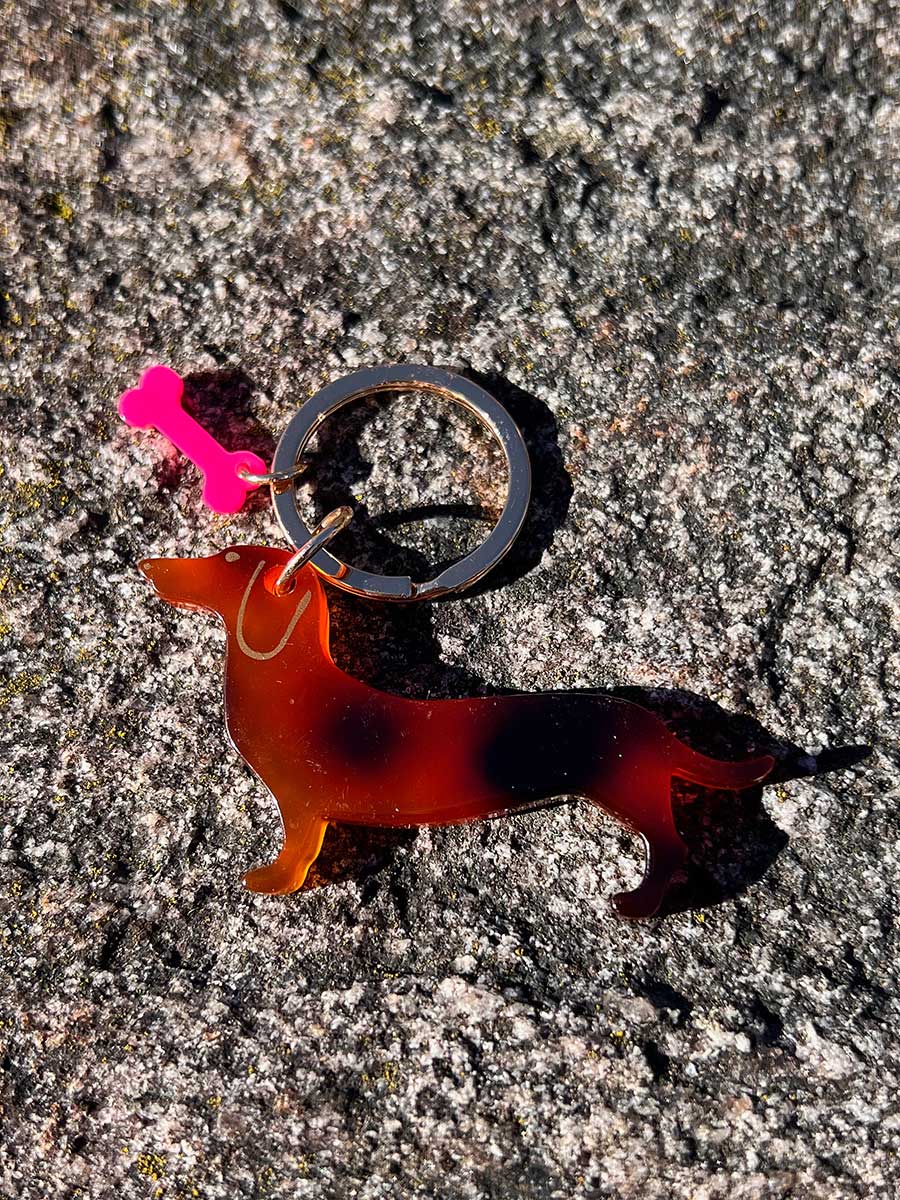 Fröhlicher Schlüsselanhänger in Form eines Dackels, stabiler Messingring. Ein tolles kleines Mitbringsel für alle Hundefreunde