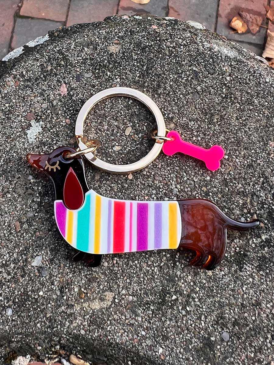 Fröhlicher Schlüsselanhänger in Form eines Dackels mit bunt gestreiftem Pullover, stabiler Messingring. Ein tolles kleines Mitbringsel für alle Hundefreunde