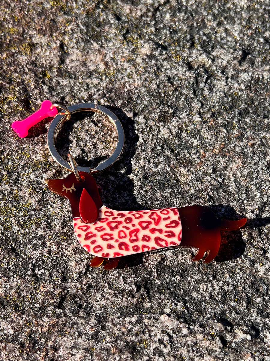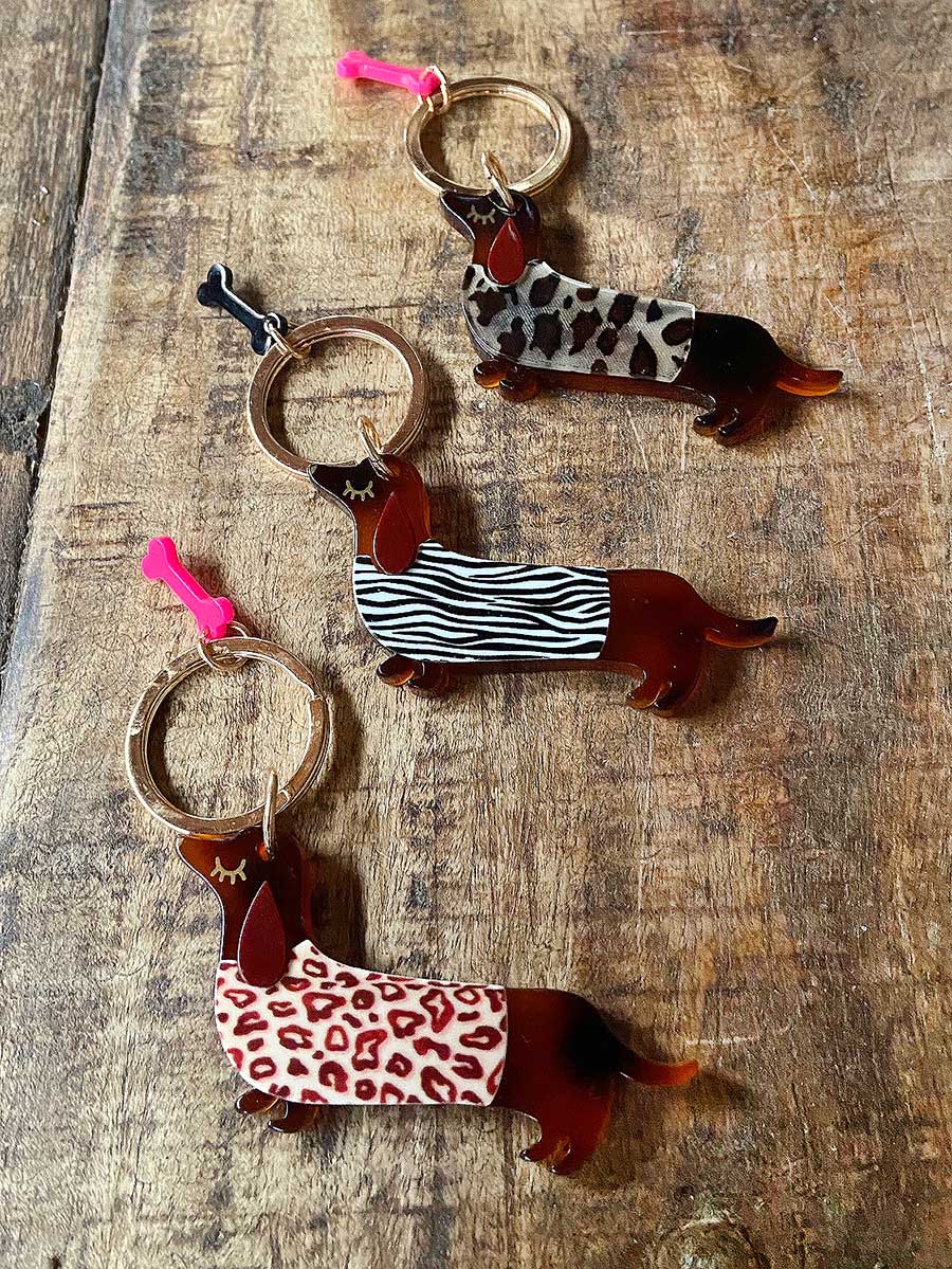 Fröhlicher Schlüsselanhänger in Form eines Dackels mit Leo Pullover, stabiler Messingring. Ein tolles kleines Mitbringsel für alle Hundefreunde