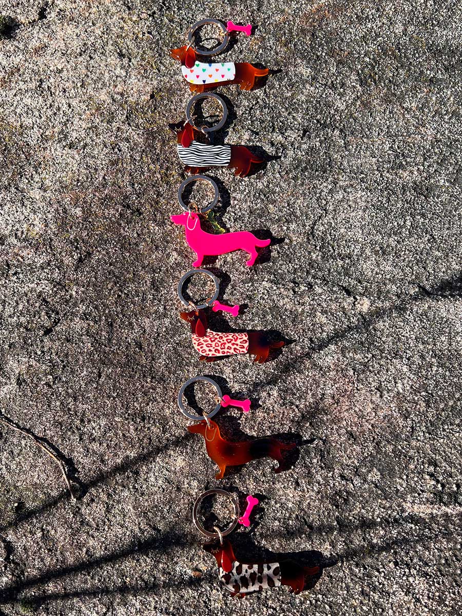 Lieferumfang: 1 Schlüsselanhänger Dackel Leo Pullover Acryl Kunststoff Messingring von Mea Living