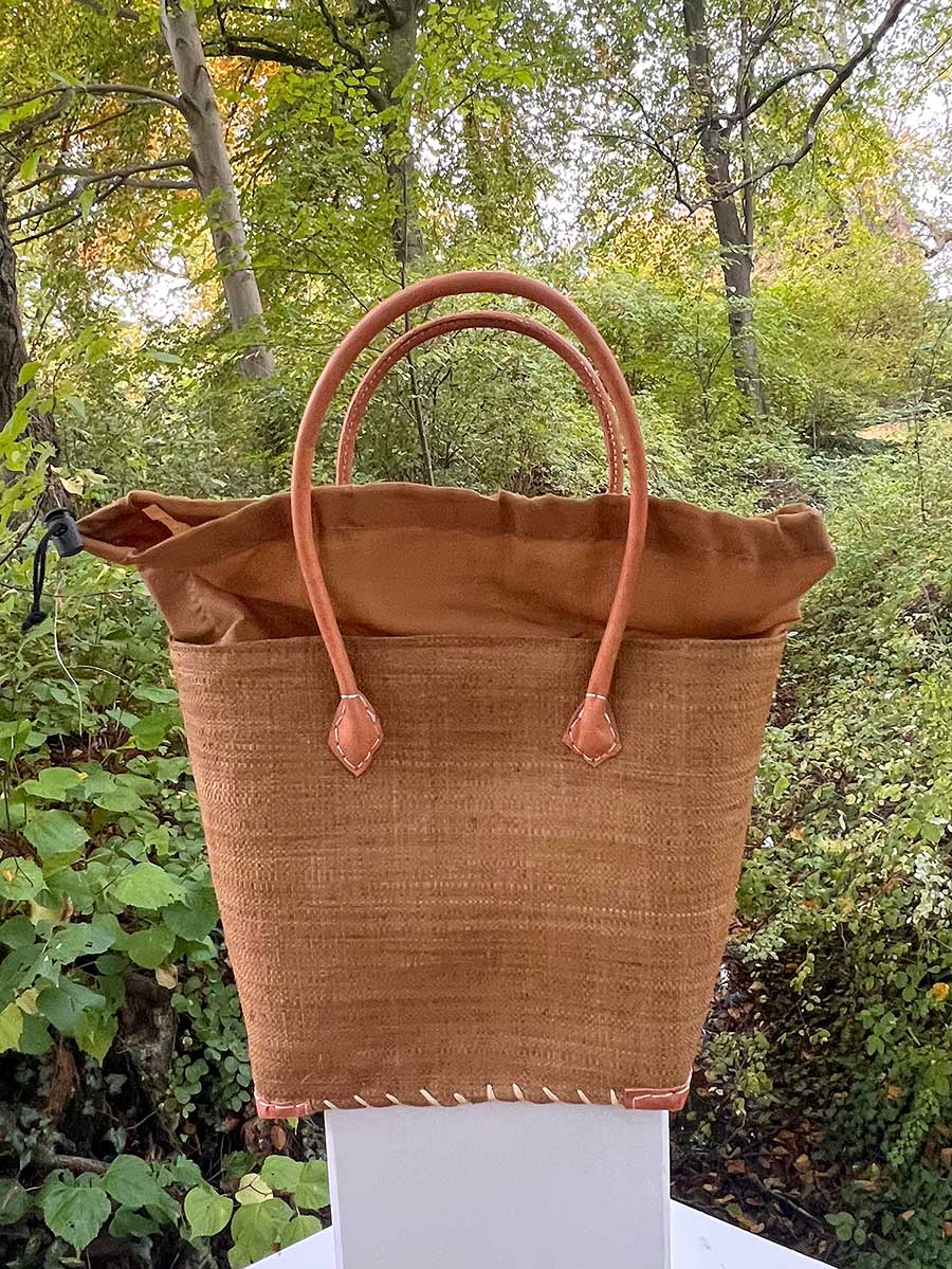 Eleganter Shopper von frosch & rabe aus Palmblattfasern haselnussbraun mit bequemen rund genähten Lederhenkeln. Jede Tasche ist ein handgefertigtes Einzelstück / Naturprodukt.