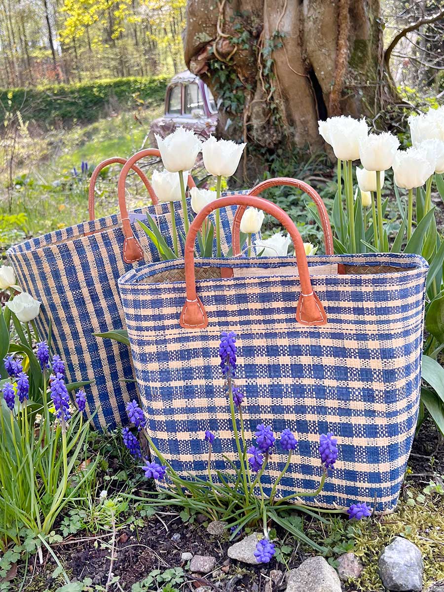 Eleganter Shopper von frosch & rabe aus Palmblattfasern in königsblau kariert mit bequemen rund genähten Lederhenkeln. Jede Tasche ist ein handgefertigtes Einzelstück / Naturprodukt.