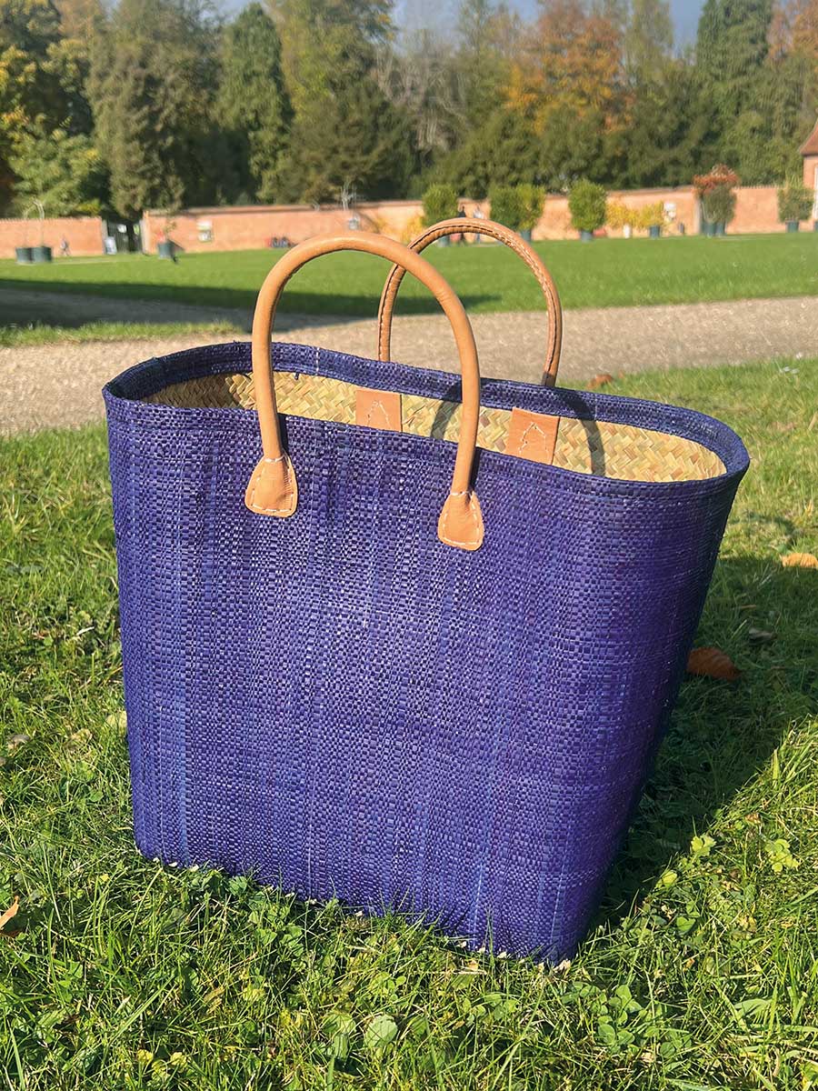 Farbenfroher Shopper von frosch & rabe aus Palmblattfasern in einem tollen royalblau mit kurzen rund genähten Lederhenkeln. Jede Tasche ist ein handgefertigtes Einzelstück / Naturprodukt.