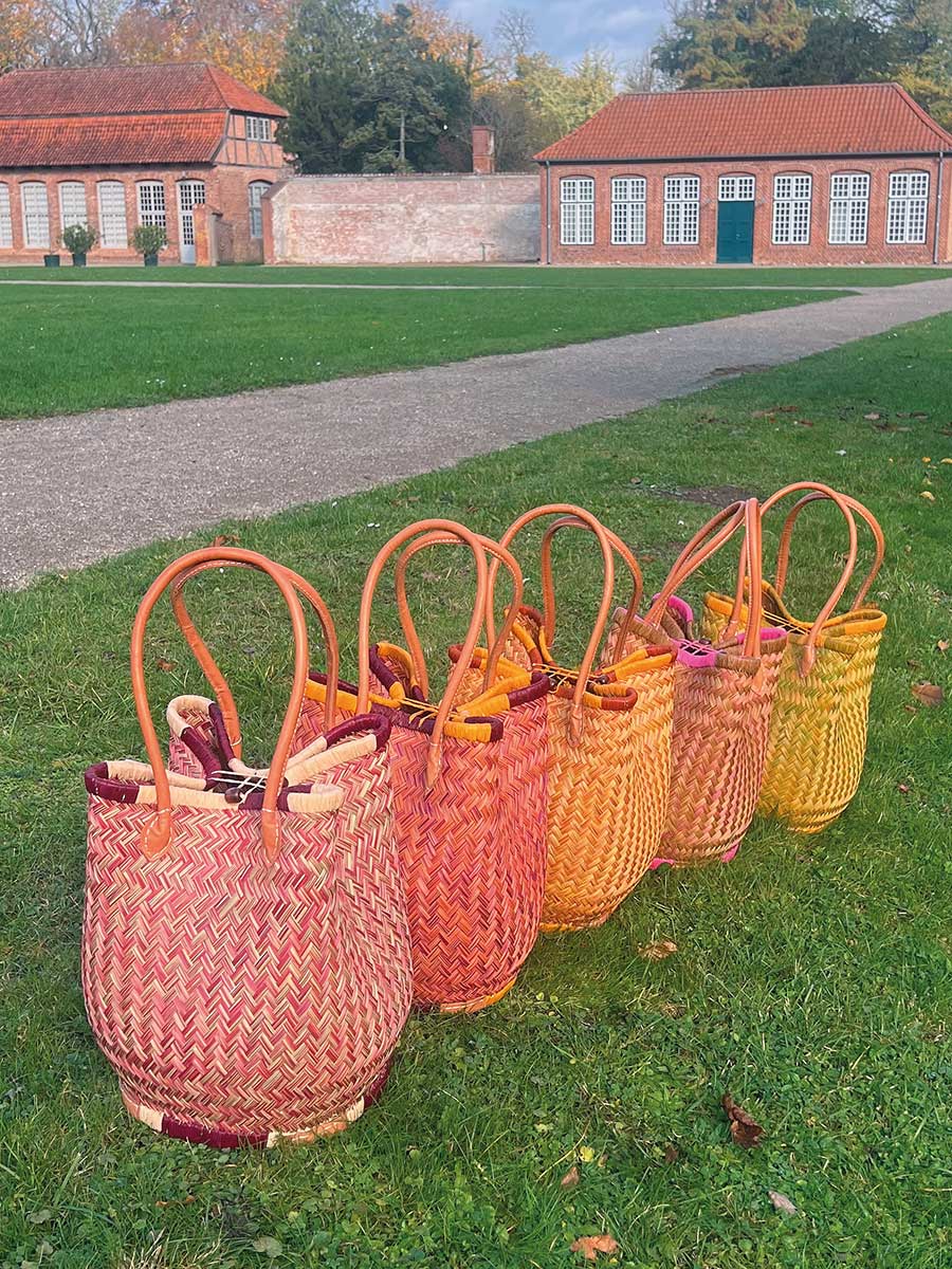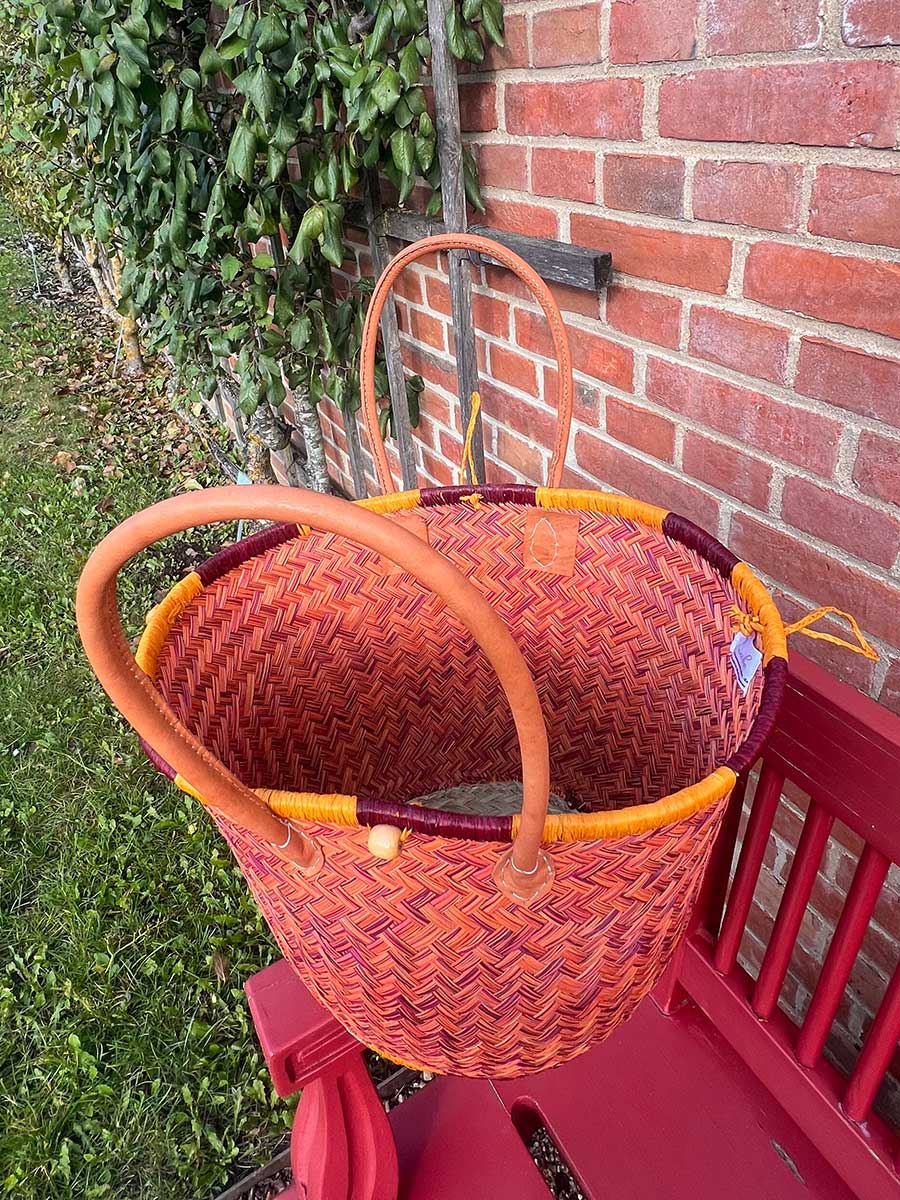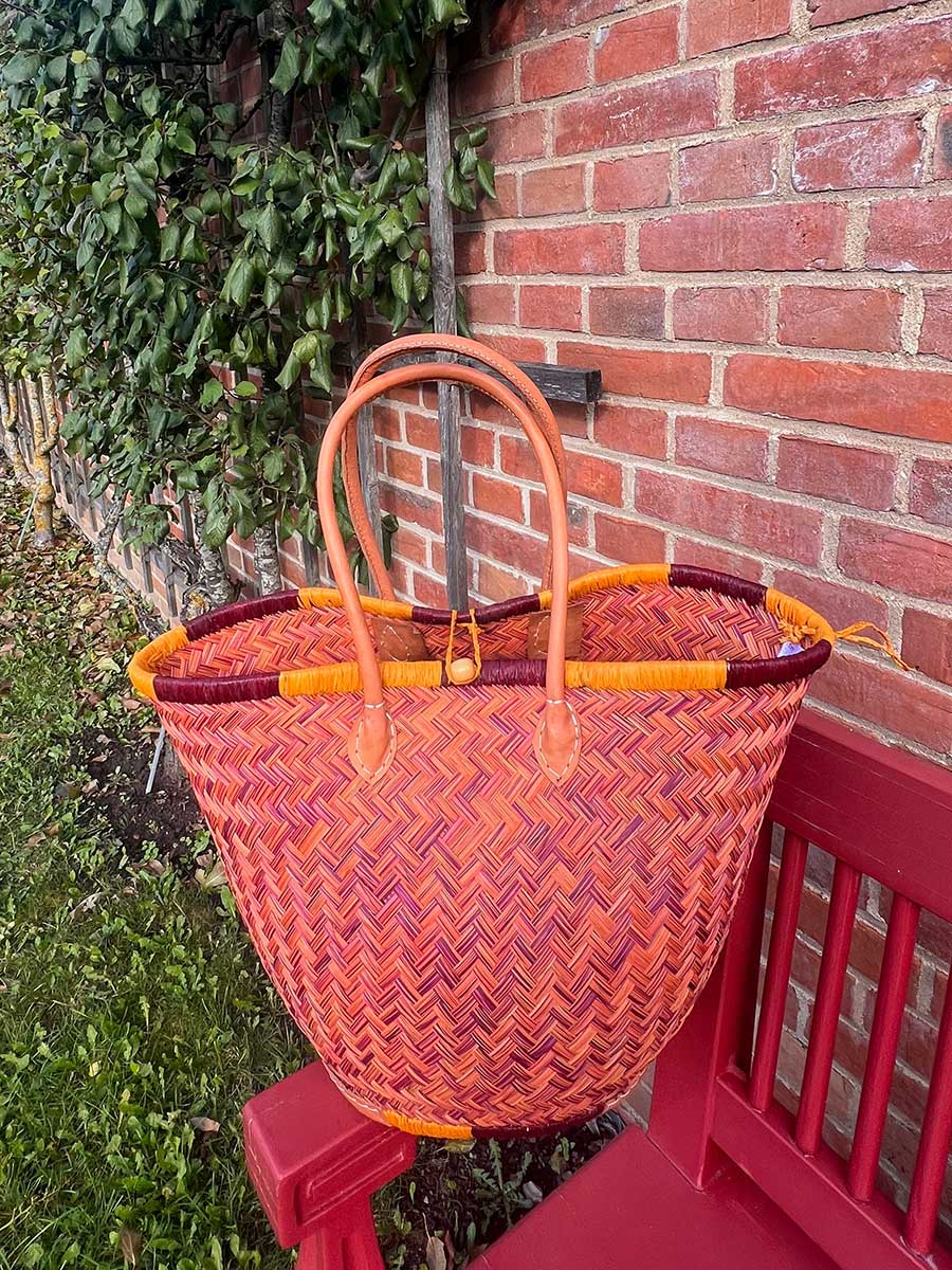 Eleganter Shopper von frosch & rabe aus Palmblattfasern in einem tollen curry bordeaux mit langen rund genähten Lederhenkeln. Jede Tasche ist ein handgefertigtes Einzelstück / Naturprodukt.