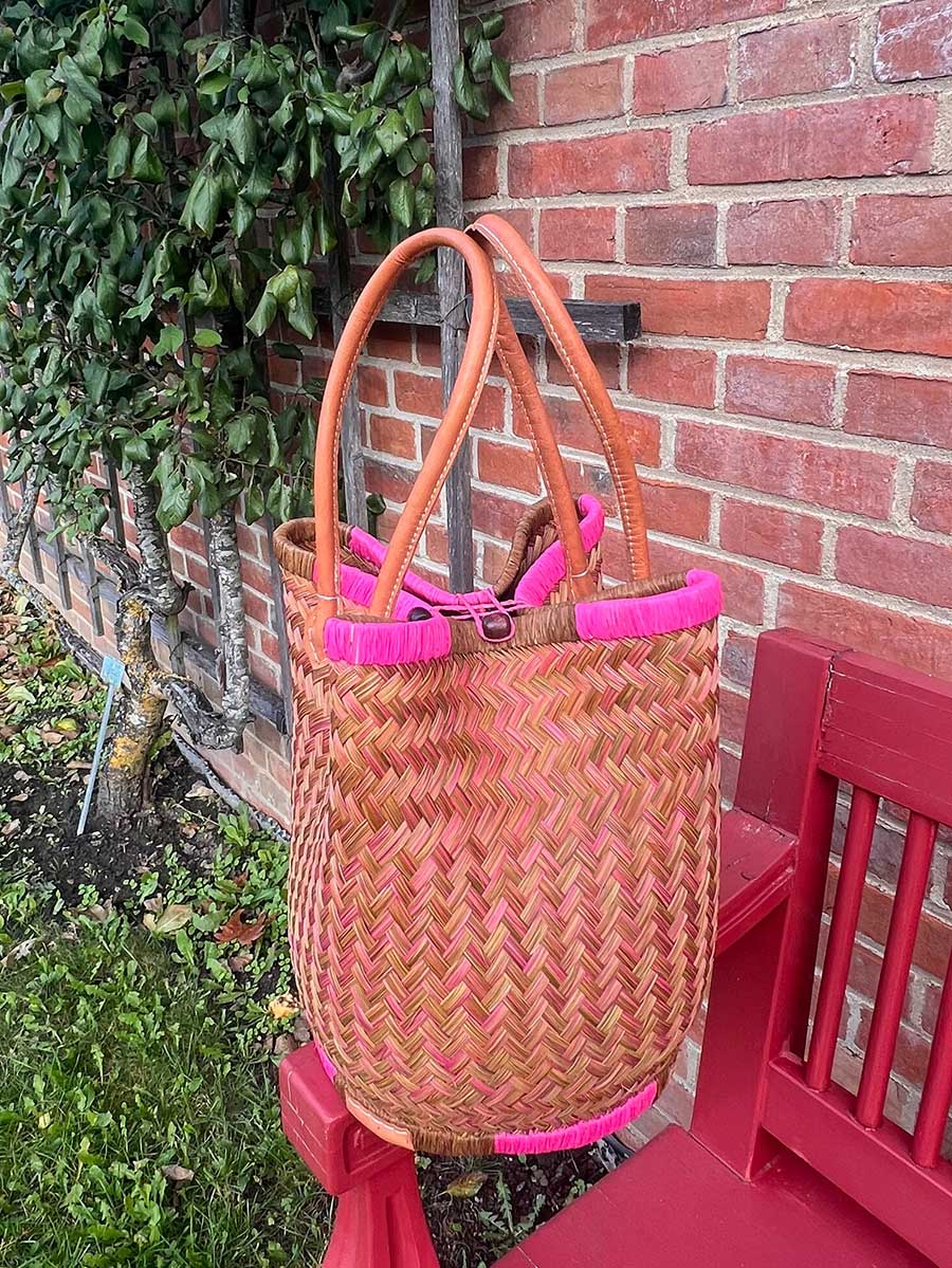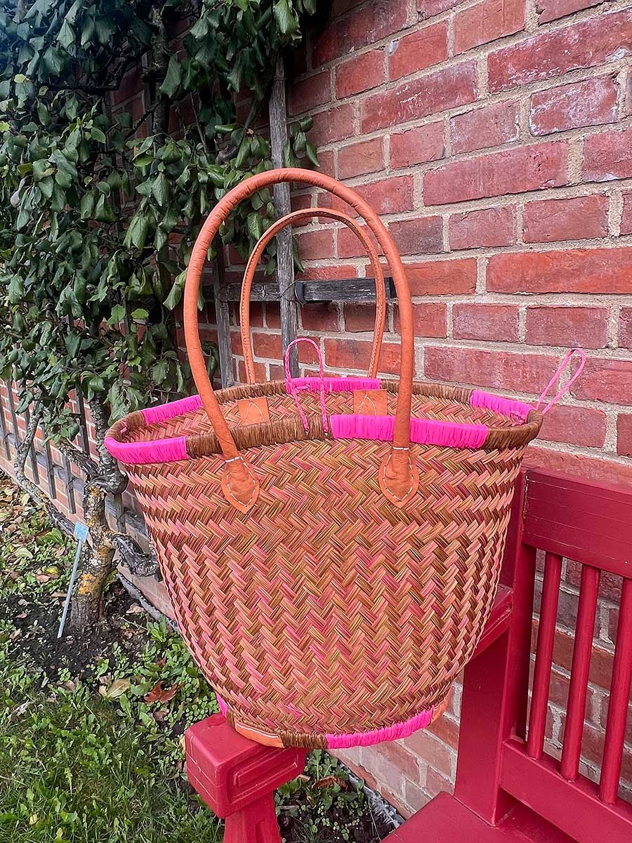 Eleganter Shopper von frosch & rabe aus Palmblattfasern in einem tollen pink olive mit langen rund genähten Lederhenkeln. Jede Tasche ist ein handgefertigtes Einzelstück / Naturprodukt.