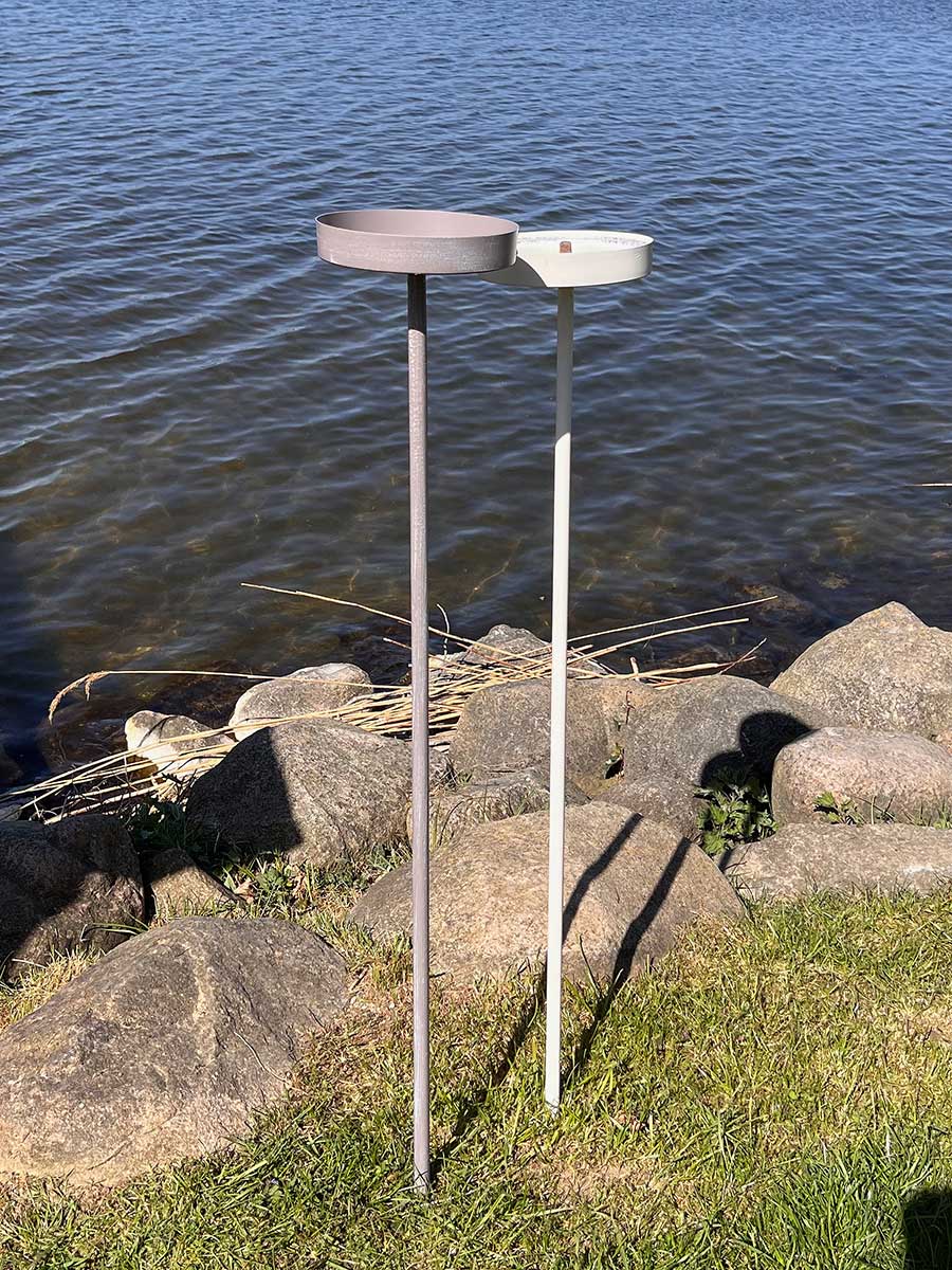 Metallstab, Gartenstecker, Flammschalenhalter in creme. Die flache Schale wird auf den Stab geschraubt und kann sehr vielseitig dekoriert werden. Ideal geeignet zum Einsetzen einer Flammschale bis 16,5 cm oder für ein Windlicht mit dicker Stumpenkerzen. Die Schale kann auch wunderbar floral geschmückt werden mit einem Kranz oder einer Pflanzschale.