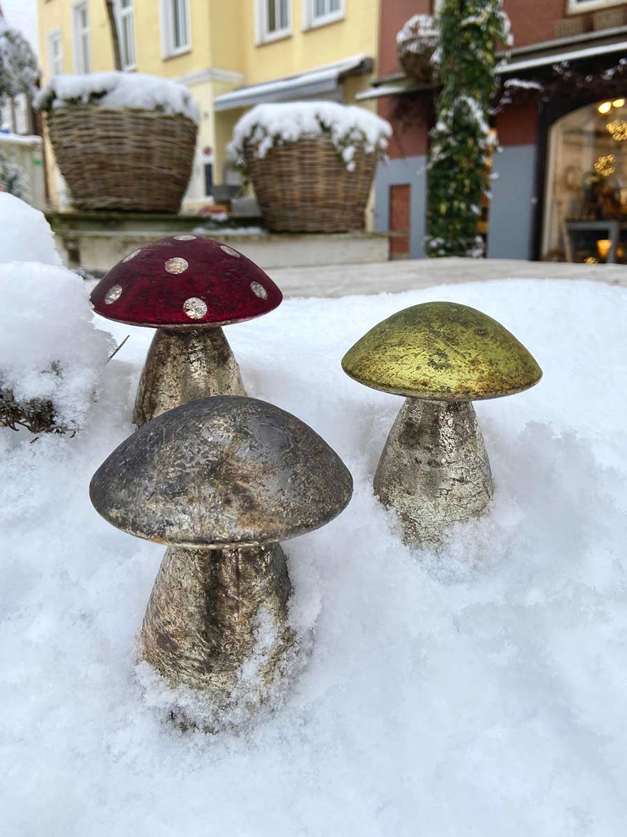 Dekorativer mittelgroßer Glaspilz mit rot gepunktetem Schirm in "Bauernsilberoptik" - tolles Dekorationselement für den Innen-und Außenbereich, im Steingarten- und Beetbereich oder einfach auf der Fensterbank oder Kommode. Ein schöner Blickfang ist dieser Pilz in Grüppchen arrangiert oder in Pflanzschalen auf Moos.