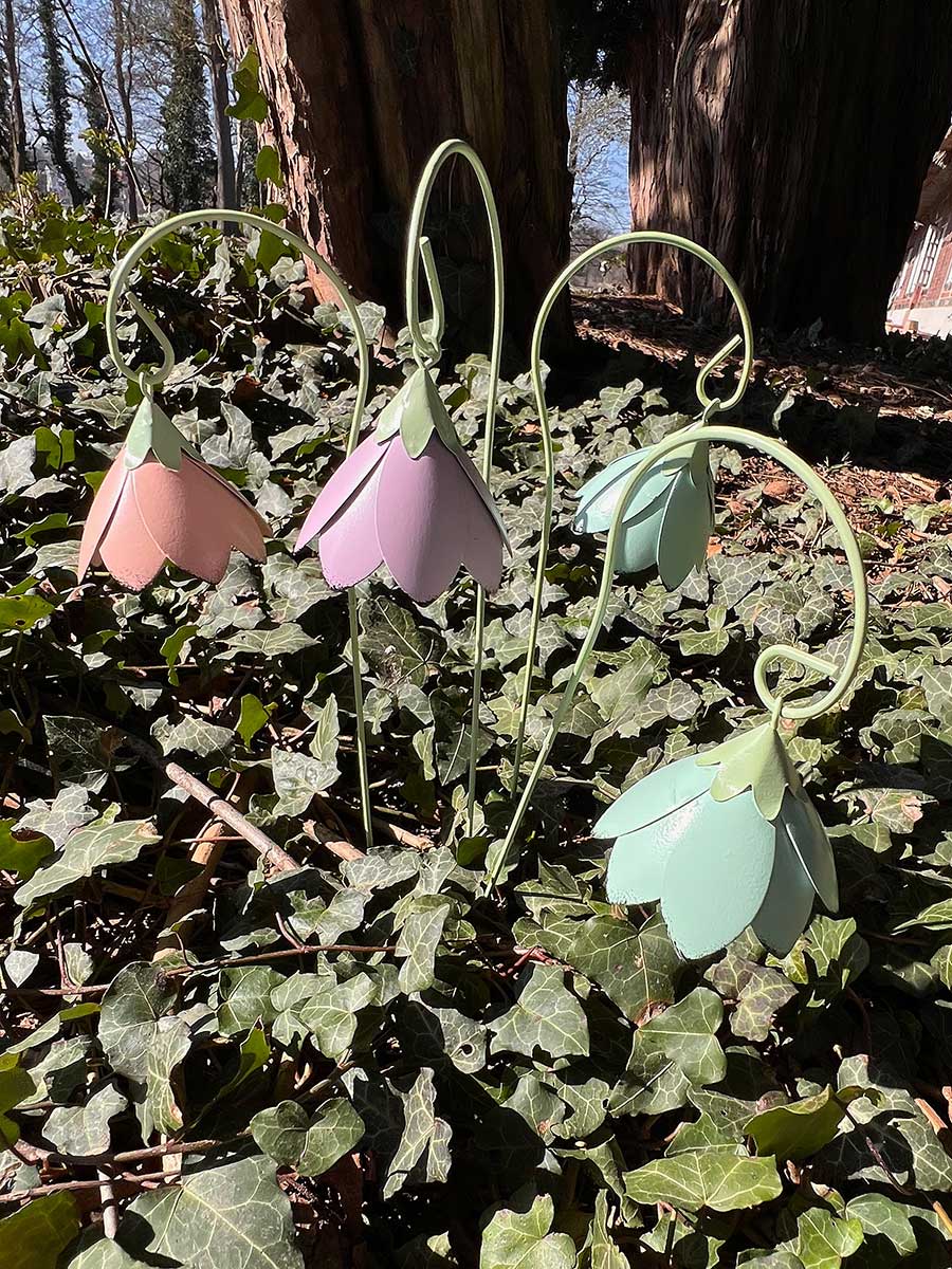 Charmante Metallblumen-Gartenstecker, besonders hübsch sind die Picker in Grüppchen aus verschiedenen Farben. Tolle Dekoration für Garten, Balkon und Pflanzkübel