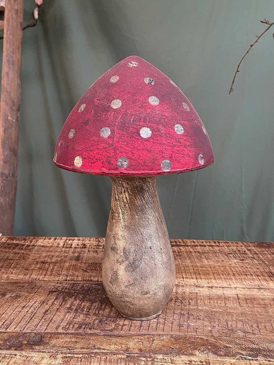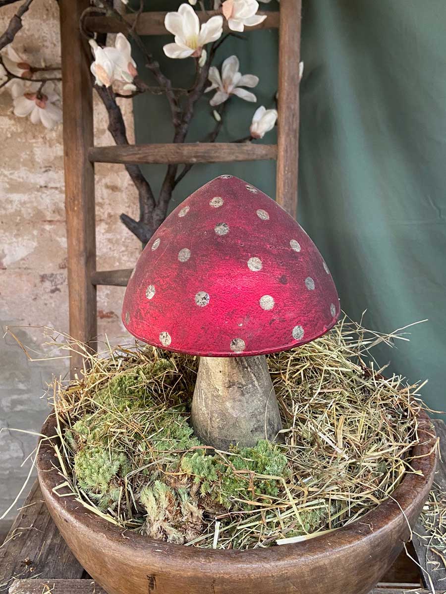 Großer Shabby Glas Dekopilz rot mit Punkten bauernsilber H28