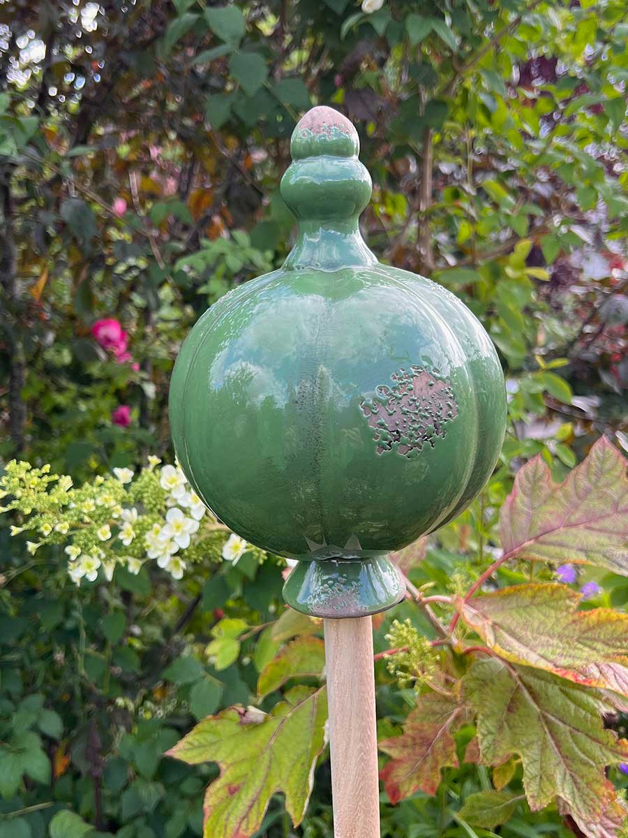 Steingut Gartenkugel im Vintage Landhaus Design antikgrün zum Aufstecken auf einen Holzstiel zum Beispiel Besenstiel. Die glasierte Gartenkugel hat gewollte Abschürfungen und kann auch ohne Stiel aufgestellt werden. Der Holzstiel ist nicht im Lieferumfang enthalten.