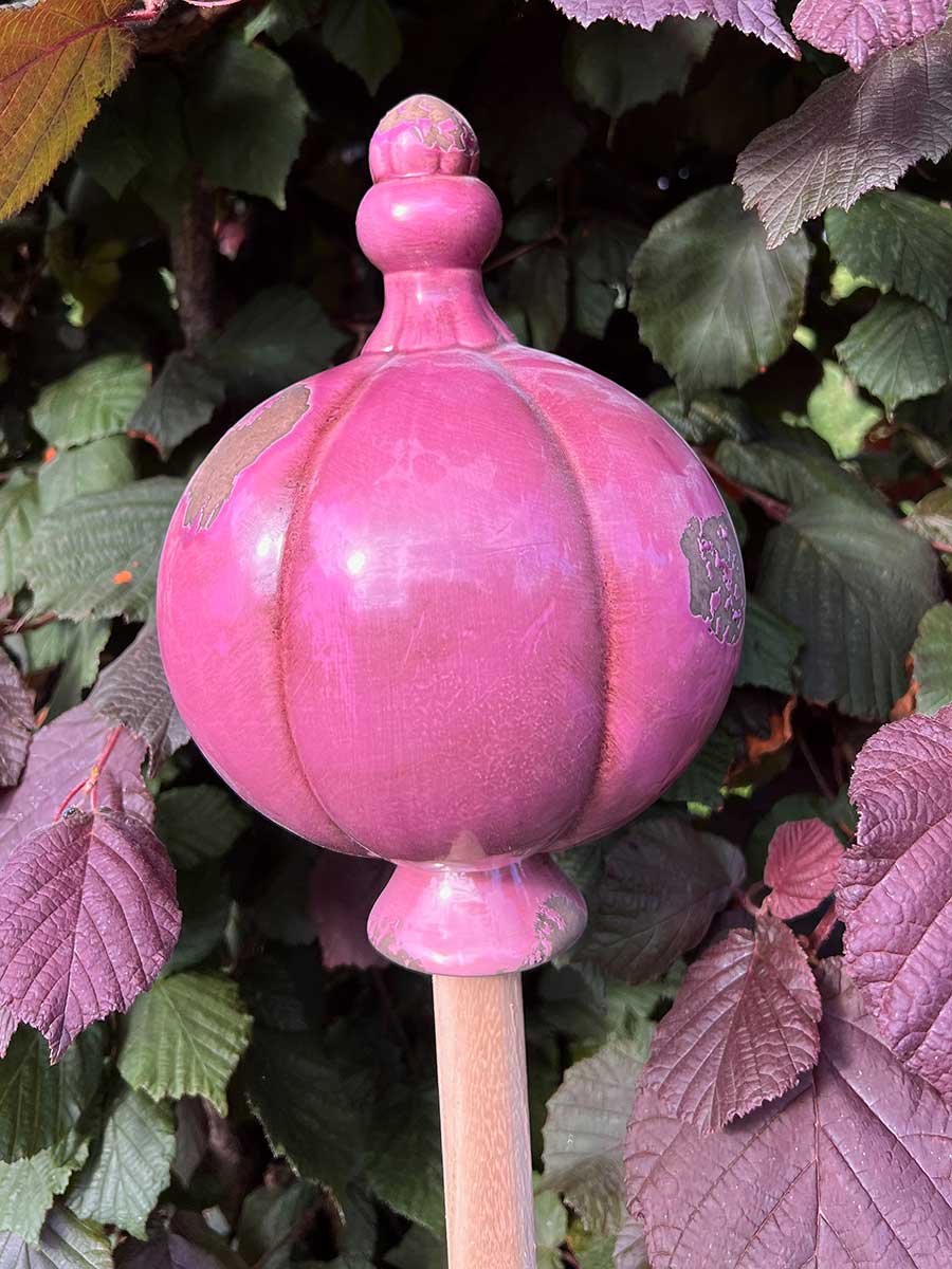 Steingut Gartenkugel im Vintage Landhaus Design antikviolet zum Aufstecken auf einen Holzstiel zum Beispiel Besenstiel. Die glasierte Gartenkugel hat gewollte Abschürfungen und kann auch ohne Stiel aufgestellt werden. Der Holzstiel ist nicht im Lieferumfang enthalten.