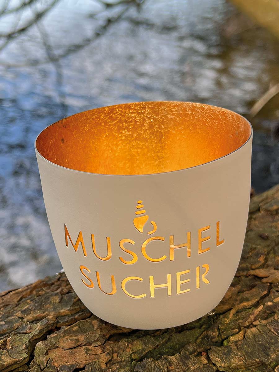 Madras Windlicht M Motiv Muschelsucher sandstone-gold GiftCompany 8,5 cm