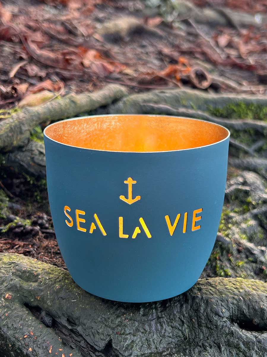 Madras Windlicht M Motiv Sea la vie petrol-gold GiftCompany