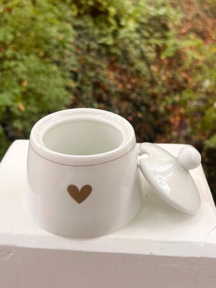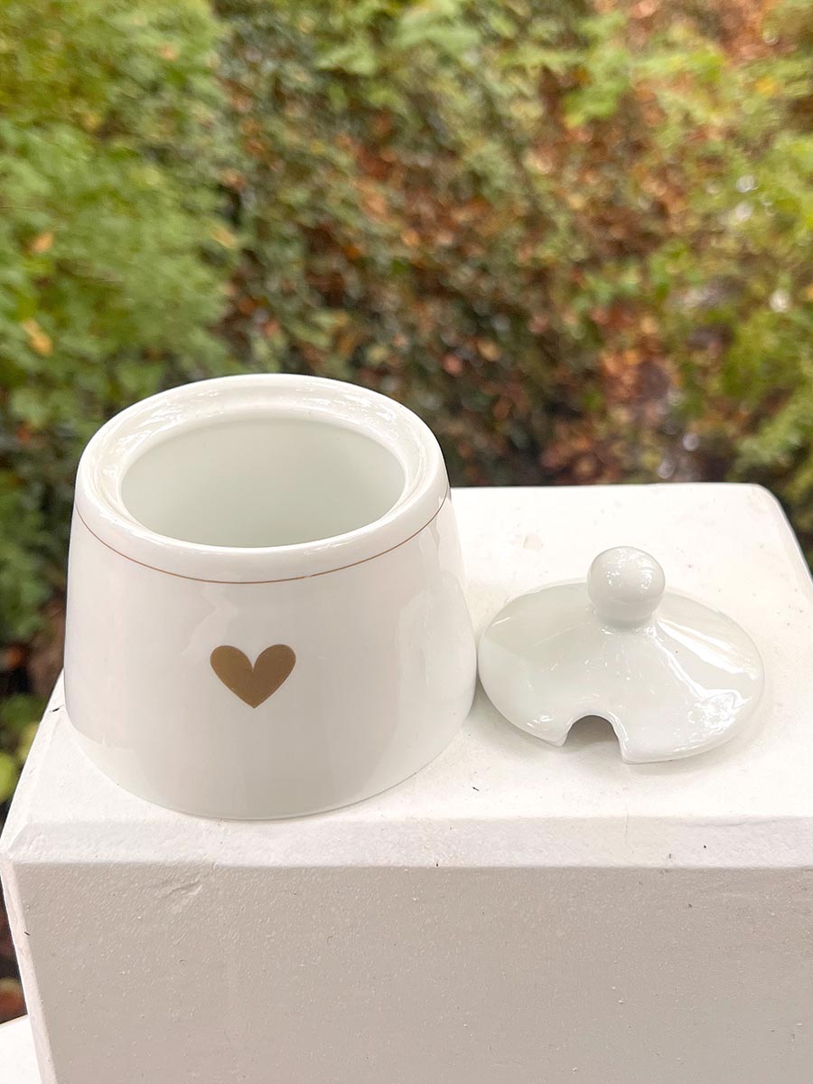 Hübsche Porzellan Zuckerdose mit goldenem Herz von Krasilnikoff. Die dänische Firma steht für zeitlos schöne skandinavische Lebensart Wohnaccessoires, Geschirr und Textilien.