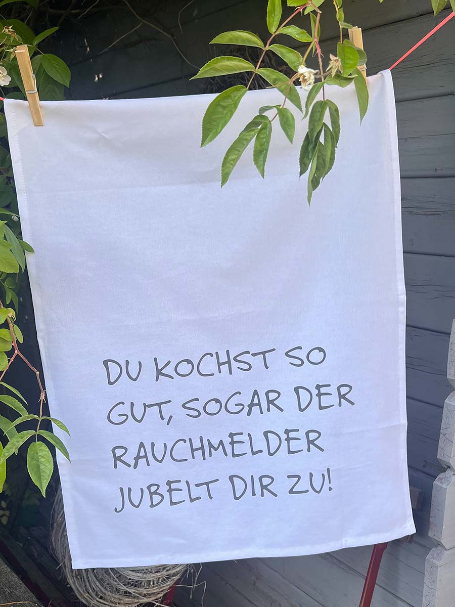 Lieferumfang: 1 Geschirrhandtuch weiß "Du kochst so gut, sogar der Rauchmelder jubelt Dir zu!" aus Baumwolle von 17;30