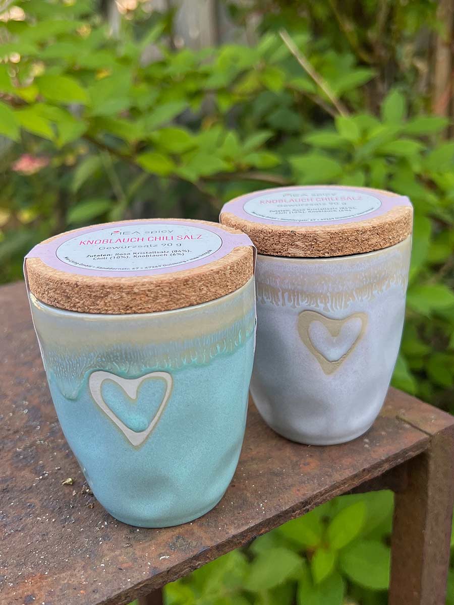 Lieferumfang: 1 x MEA Living Spicy Knoblauch Chili Salz 90 g Stoneware-Becher Herz türkis