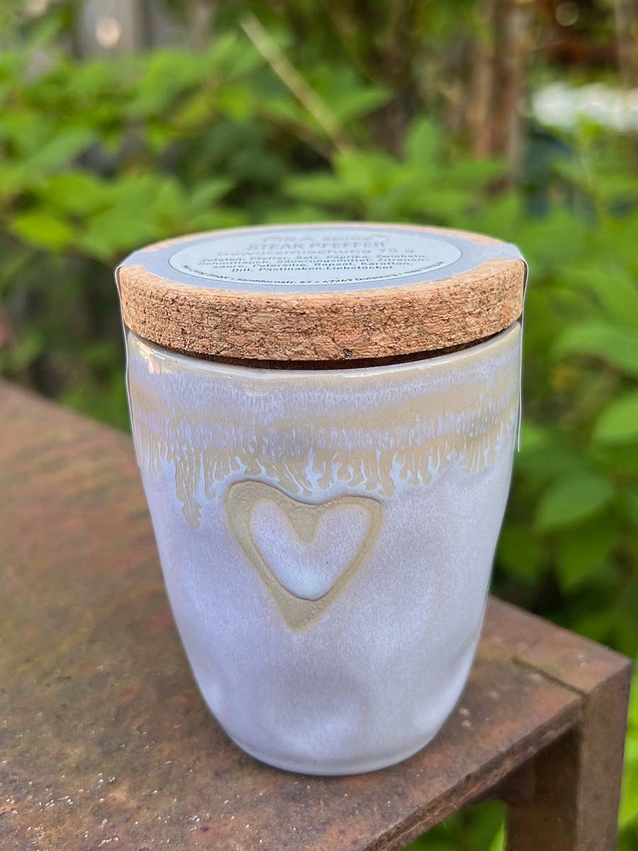 Gewürzmischung Steak Pfeffer im hübschen Steingutbecher mit Korkdeckel