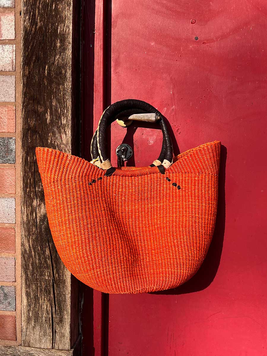 Handgefertigter Shopper Bolga Korb aus Elefantengras in einem tollen orange mit kurzen rund genähten Lederhenkeln - tolles ausgefallenes Design. Jede Tasche ist ein handgefertigtes Einzelstück / Naturprodukt. Bolga ist eine Abkürzung für Bolgatanga - ein Ort im Norden Ghanas. In traditioneller Flechttechnik stellen Frauen hier die exklusiven Einkaufskörbe für AMA Fashion her. In einer gemeinsamen Partnerschaft entwickeln die Flechterinnen mit AMA Fashion neue Design und Farben.