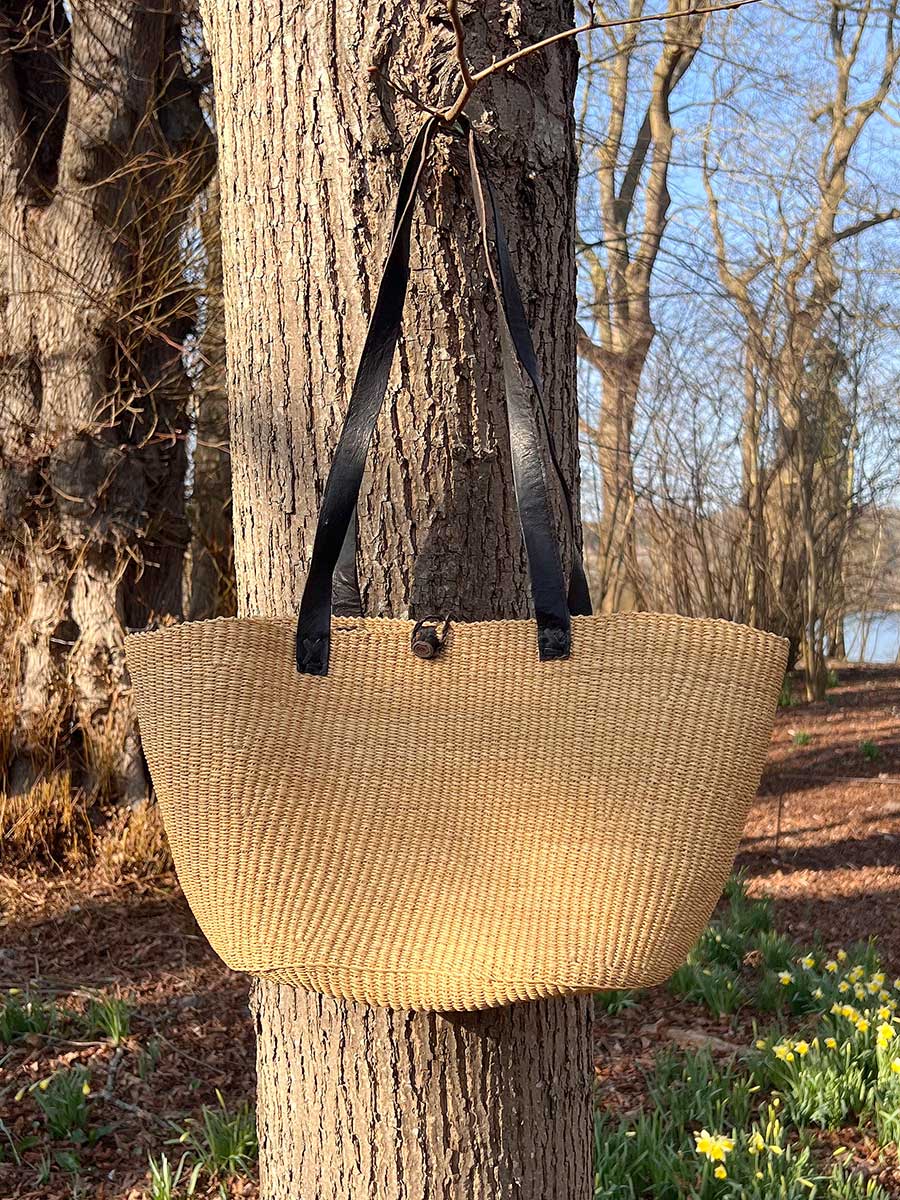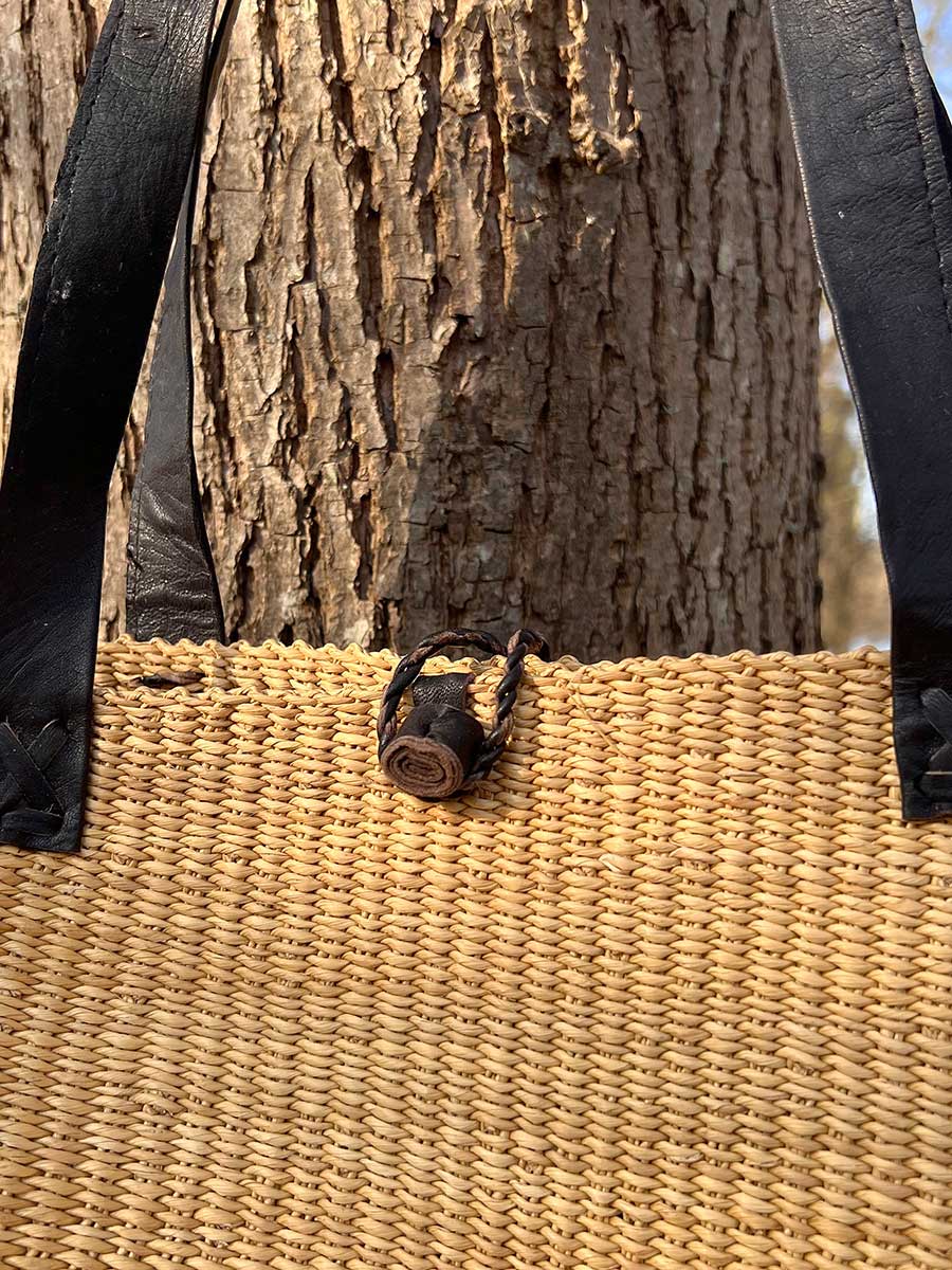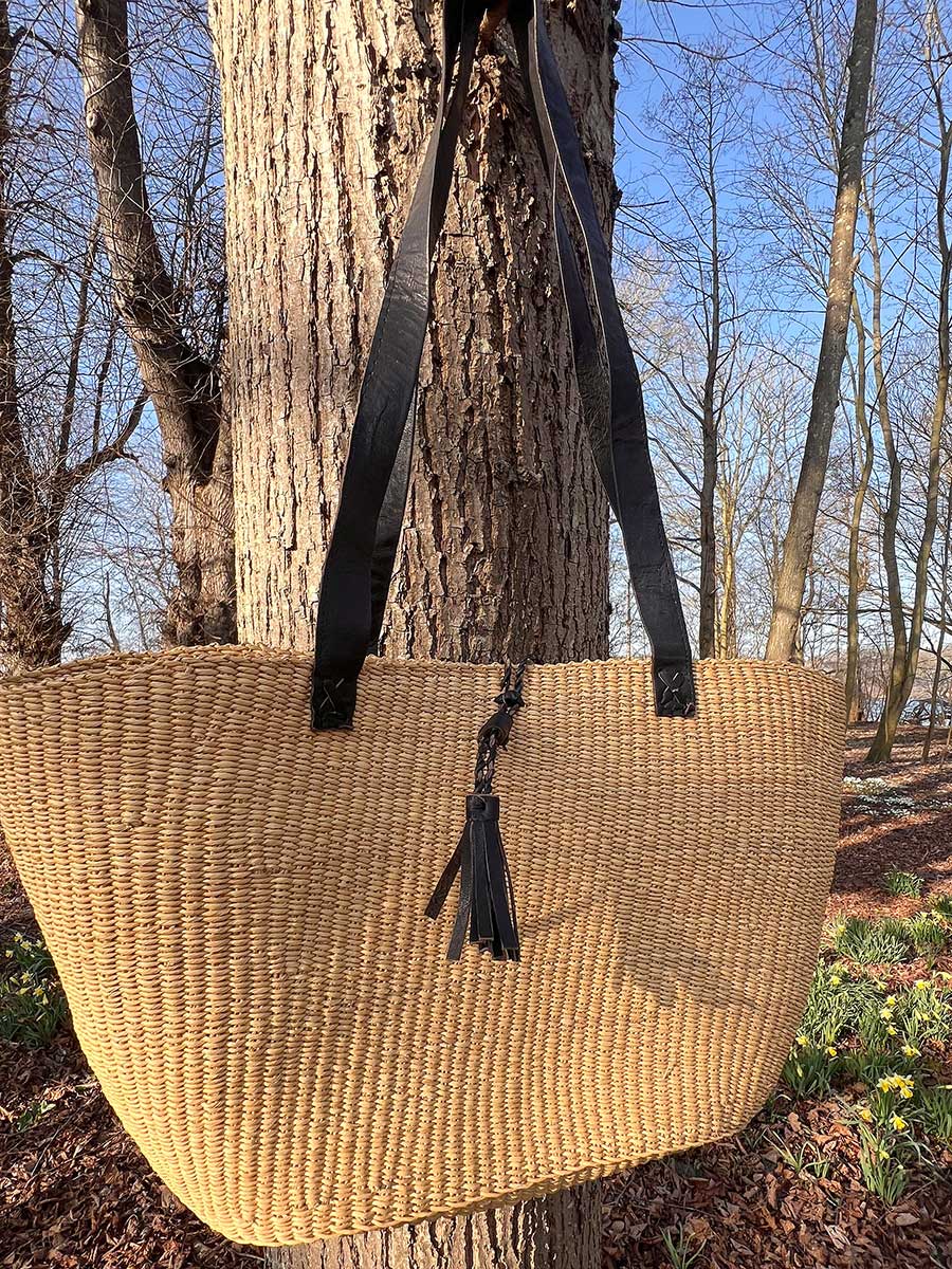 Handgefertigter Shopper Bolga Korb Umhängetasche aus Elefantengras mit langen Lederriemen - tolles ausgefallenes Design. Jede Tasche ist ein handgefertigtes Einzelstück / Naturprodukt. Bolga ist eine Abkürzung für Bolgatanga - ein Ort im Norden Ghanas. In traditioneller Flechttechnik stellen Frauen hier die exklusiven Einkaufskörbe für AMA Fashion her. In einer gemeinsamen Partnerschaft entwickeln die Flechterinnen mit AMA Fashion neue Design und Farben.