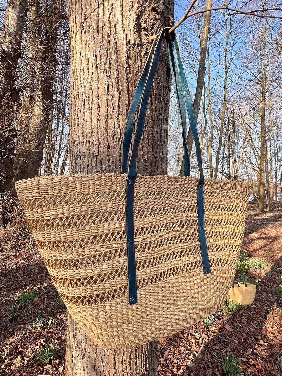 Handgefertigter Shopper Bolga Tasche aus Elefantengras naturfarben - tolles ausgefallenes Netz-Design. Jede Tasche ist ein handgefertigtes Einzelstück / Naturprodukt. Bolga ist eine Abkürzung für Bolgatanga - ein Ort im Norden Ghanas. In traditioneller Flechttechnik stellen Frauen hier die exklusiven Einkaufskörbe für AMA Fashion her. In einer gemeinsamen Partnerschaft entwickeln die Flechterinnen mit AMA Fashion neue Design und Farben.