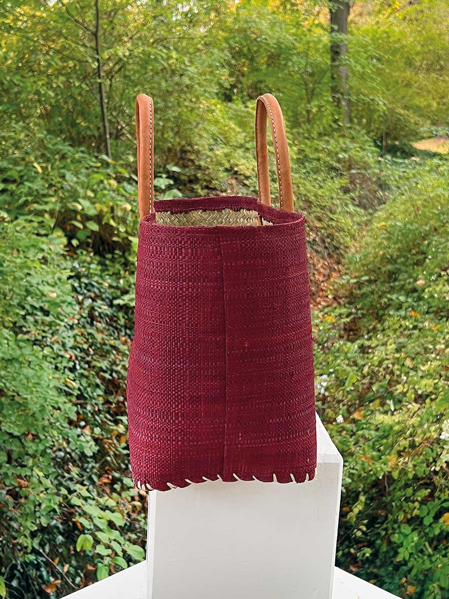 Farbenfroher Shopper von frosch & rabe aus Palmblattfasern in Brombeere mit kurzen rund genähten Lederhenkeln. Jede Tasche ist ein handgefertigtes Einzelstück / Naturprodukt.