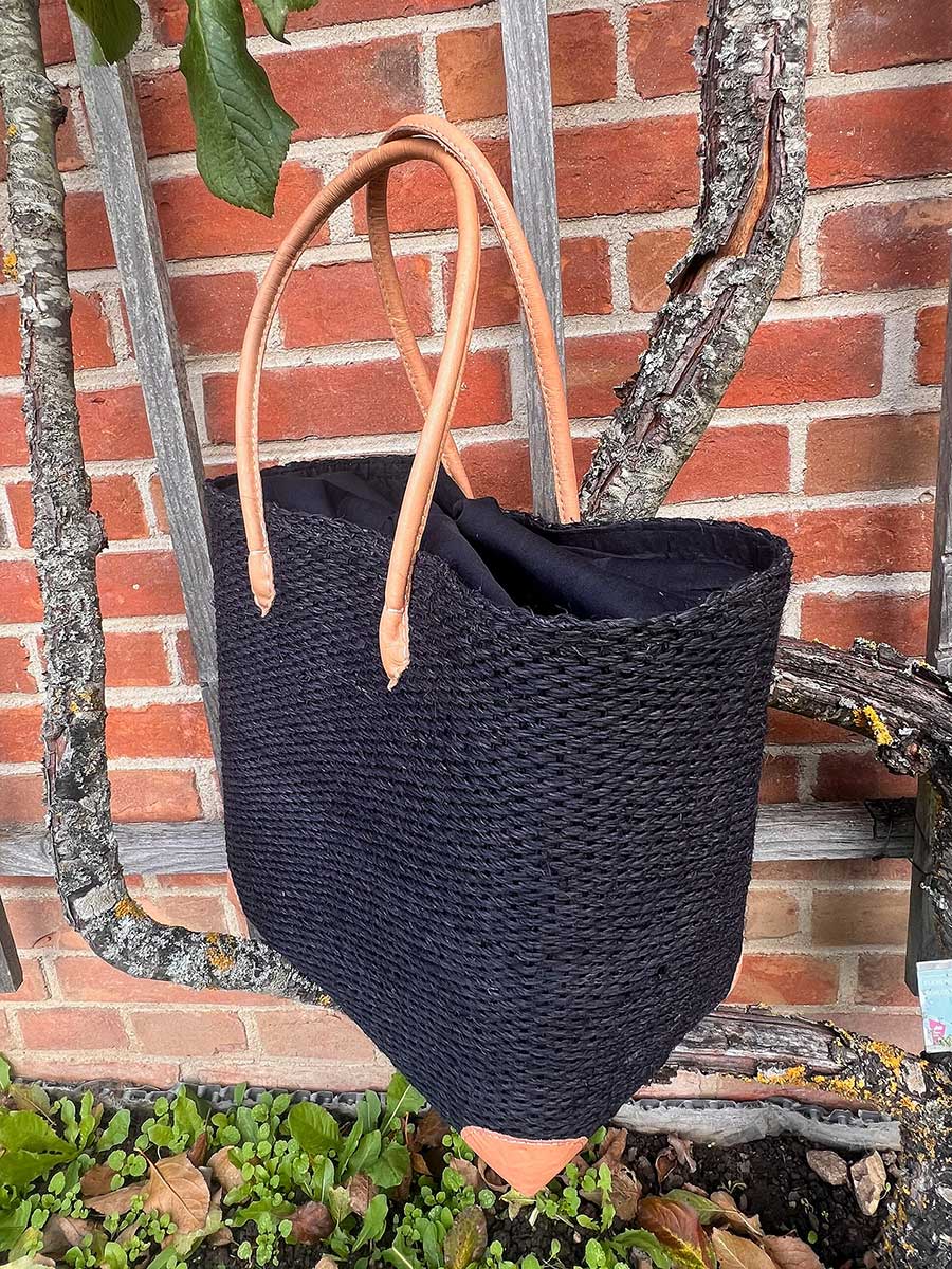 Eleganter Shopper von frosch & rabe aus Sisal in blauschwarz mit langen rund genähten Lederhenkeln und Futter - tolles Webdesign mit Lederpatches an den Bodenkanten und beiger Unterseite aus Palmblattfaser. Jede Tasche ist ein handgefertigtes Einzelstück / Naturprodukt.