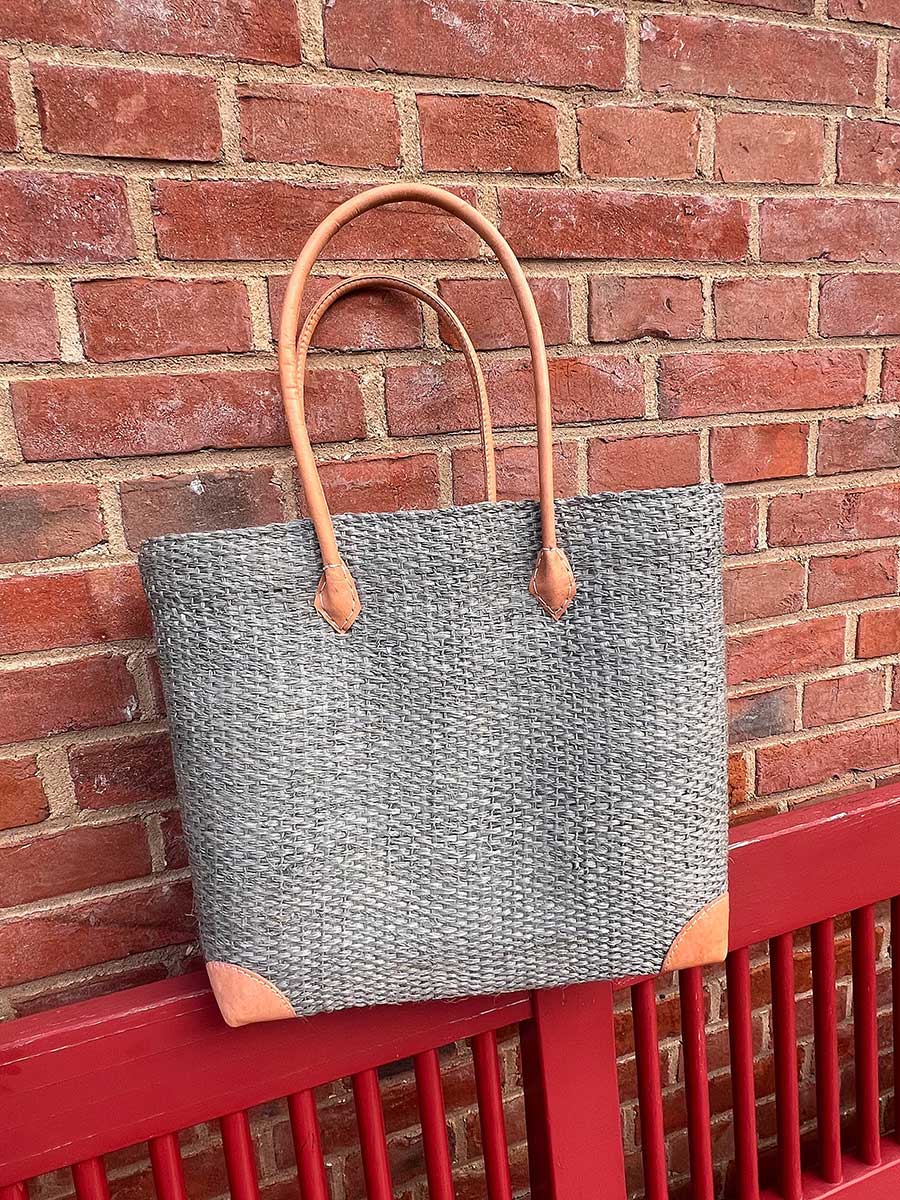 Eleganter Shopper von frosch & rabe aus Sisal in hellgrau mit langen rund genähten Lederhenkeln und Futter - tolles Webdesign mit Lederpatches an den Bodenkanten und beiger Unterseite aus Palmblattfaser. Jede Tasche ist ein handgefertigtes Einzelstück / Naturprodukt.
