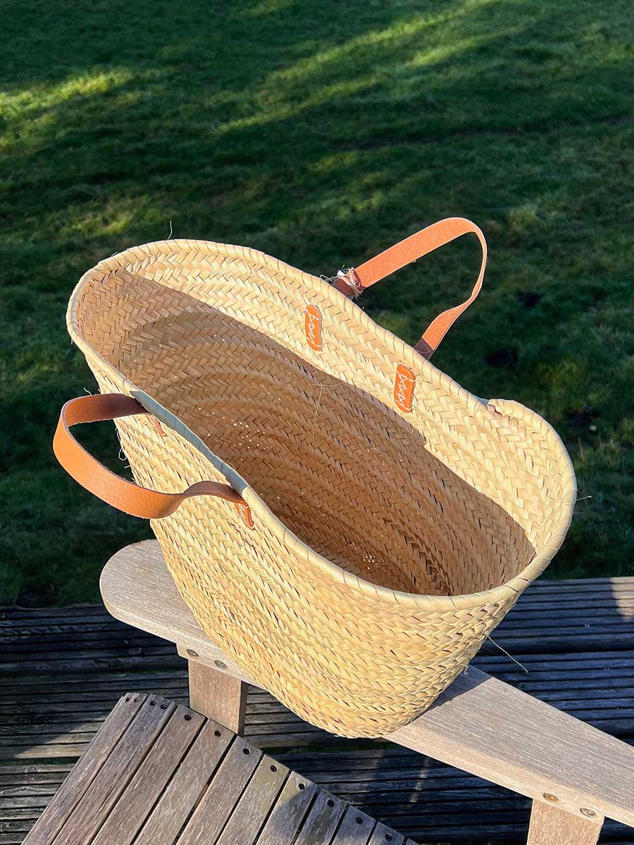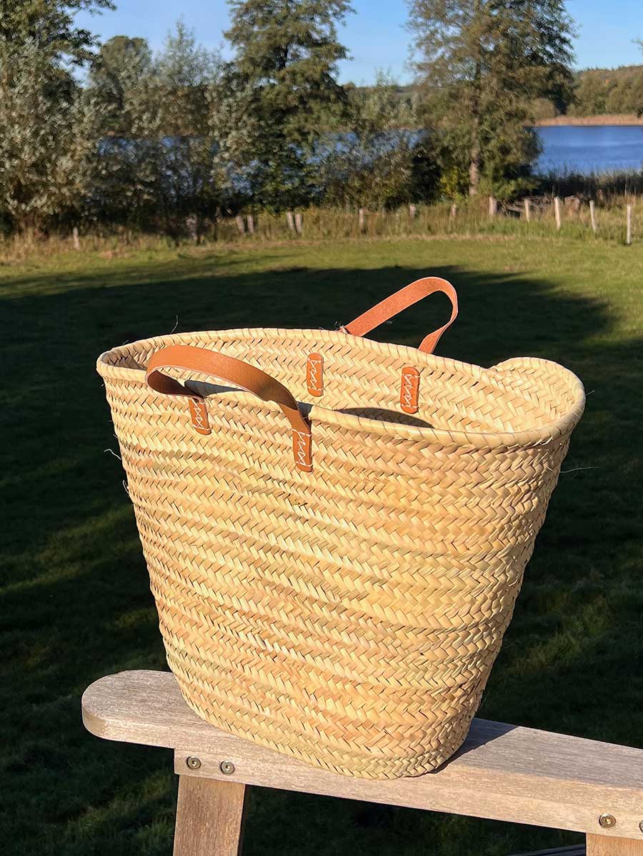 Naturfarbene konisch geschnittene XL Korbtasche mit kurzen Leder Trageriemen, oval geflochtener Boden. Jede Tasche ist ein handgefertigtes Einzelstück.