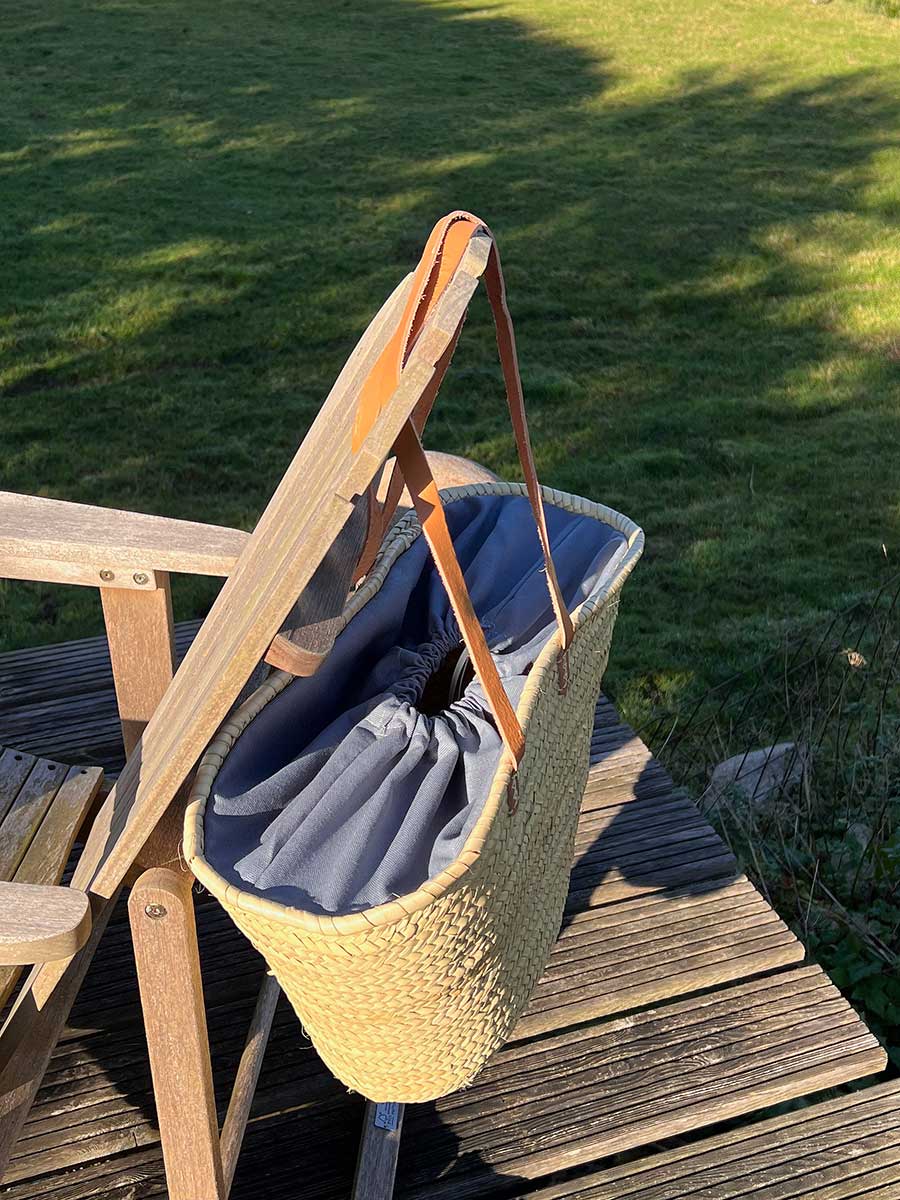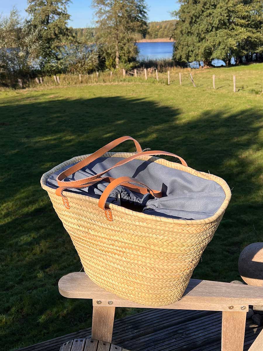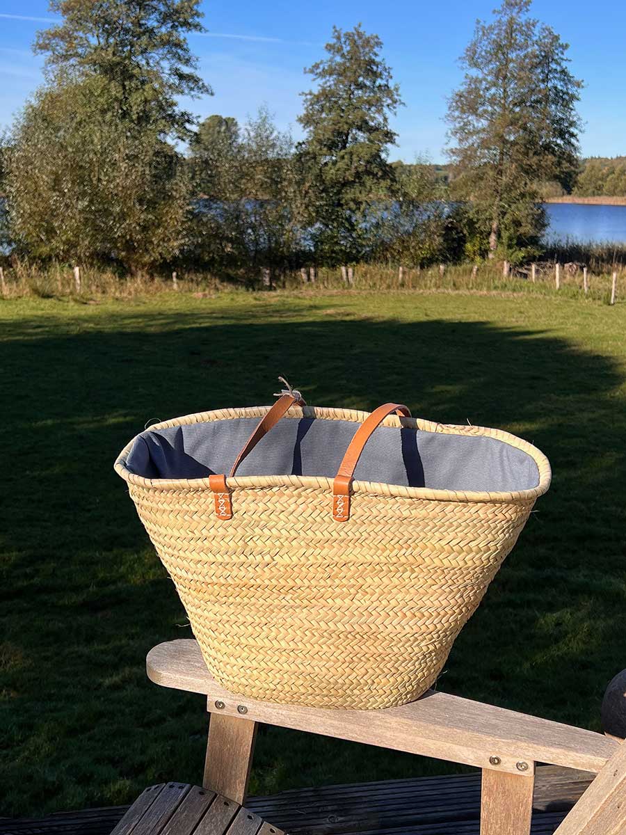 Naturfarbene konisch geschnittene XL Korbtasche mit langen Schulterriemen und grauem Futter, oval geflochtener Boden. Jede Tasche ist ein handgefertigtes Einzelstück.