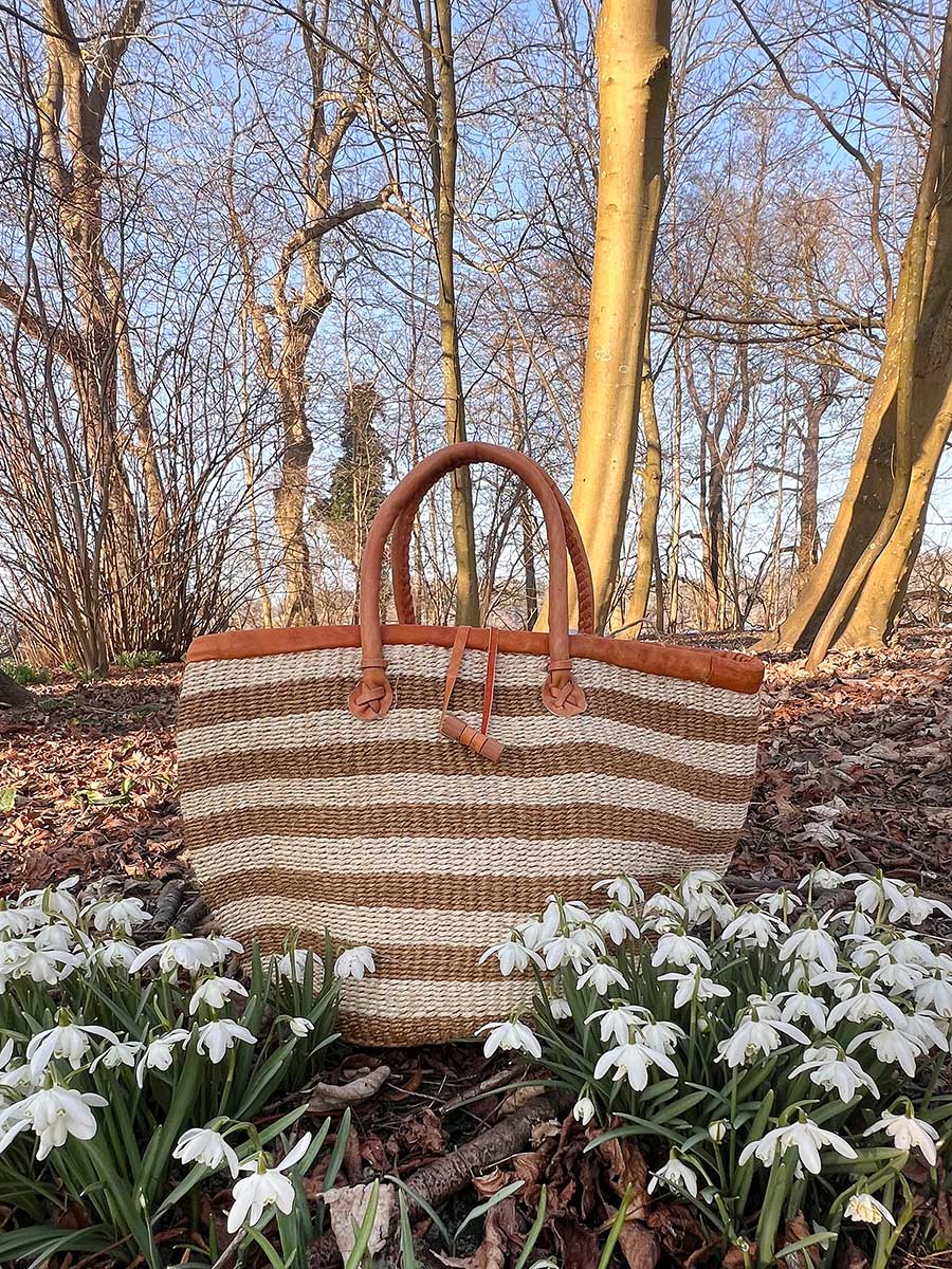 Handgefertigter Shopper Korbtasche aus Sisal beige-braun geringelt mit kurzen rund genähten Lederhenkeln, rundgeflochtener Boden - tolles ausgefallenes Design. Jede Tasche ist ein handgefertigtes Einzelstück / Naturprodukt. In traditioneller Flechttechnik stellen Frauen in Ghana die exklusiven Einkaufskörbe für AMA Fashion her. In einer gemeinsamen Partnerschaft entwickeln die Flechterinnen mit AMA Fashion neue Design und Farben.