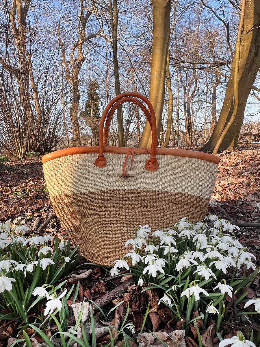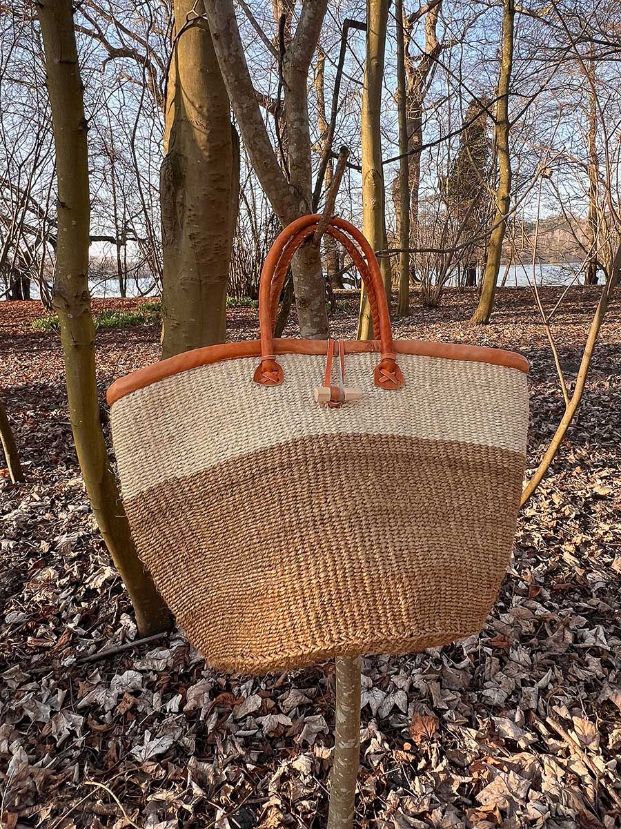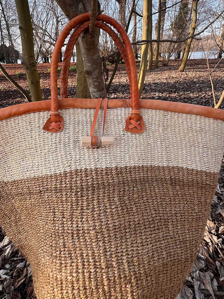 Handgefertigter Shopper Korbtasche aus Sisal beige hellbraun mit kurzen rund genähten Lederhenkeln, rundgeflochtener Boden - tolles ausgefallenes Design. Jede Tasche ist ein handgefertigtes Einzelstück / Naturprodukt. In traditioneller Flechttechnik stellen Frauen in Ghana die exklusiven Einkaufskörbe für AMA Fashion her. In einer gemeinsamen Partnerschaft entwickeln die Flechterinnen mit AMA Fashion neue Design und Farben.