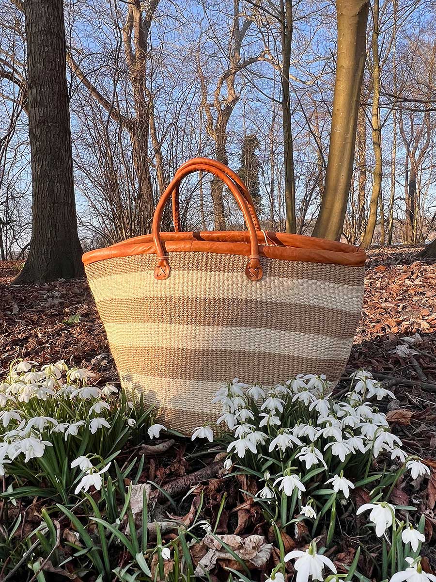 Handgefertigter XL Shopper Korbtasche aus Sisal beige braun gestreift mit kurzen rund genähten Lederhenkeln, rundgeflochtener Boden - tolles ausgefallenes Design. Jede Tasche ist ein handgefertigtes Einzelstück / Naturprodukt. In traditioneller Flechttechnik stellen Frauen in Ghana die exklusiven Einkaufskörbe für AMA Fashion her. In einer gemeinsamen Partnerschaft entwickeln die Flechterinnen mit AMA Fashion neue Design und Farben.