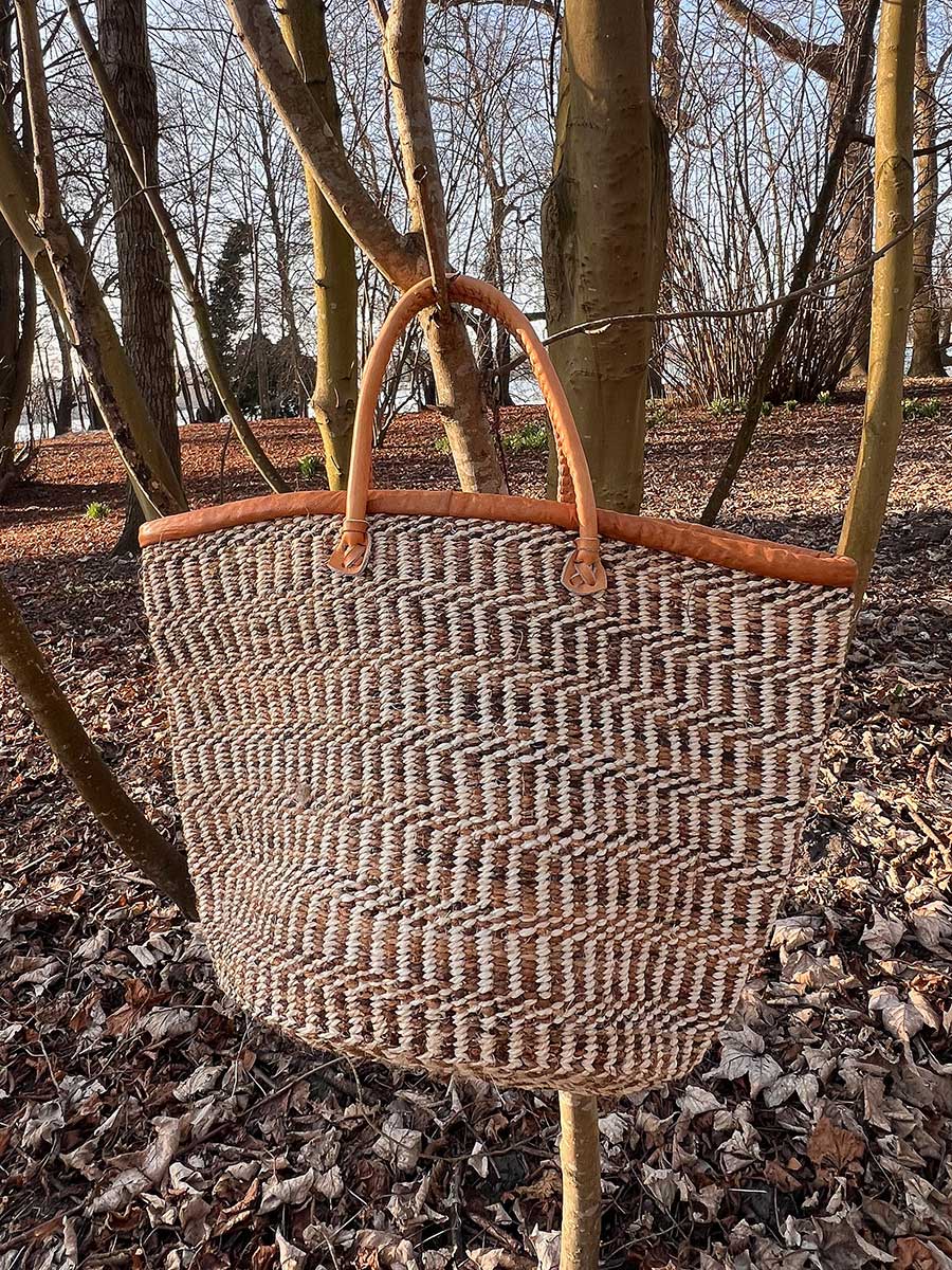 Handgefertigter XL Shopper Korbtasche aus Sisal beige braun mit kurzen rund genähten Lederhenkeln, rundgeflochtener Boden - tolles ausgefallenes Design. Jede Tasche ist ein handgefertigtes Einzelstück / Naturprodukt. In traditioneller Flechttechnik stellen Frauen in Ghana die exklusiven Einkaufskörbe für AMA Fashion her. In einer gemeinsamen Partnerschaft entwickeln die Flechterinnen mit AMA Fashion neue Design und Farben.