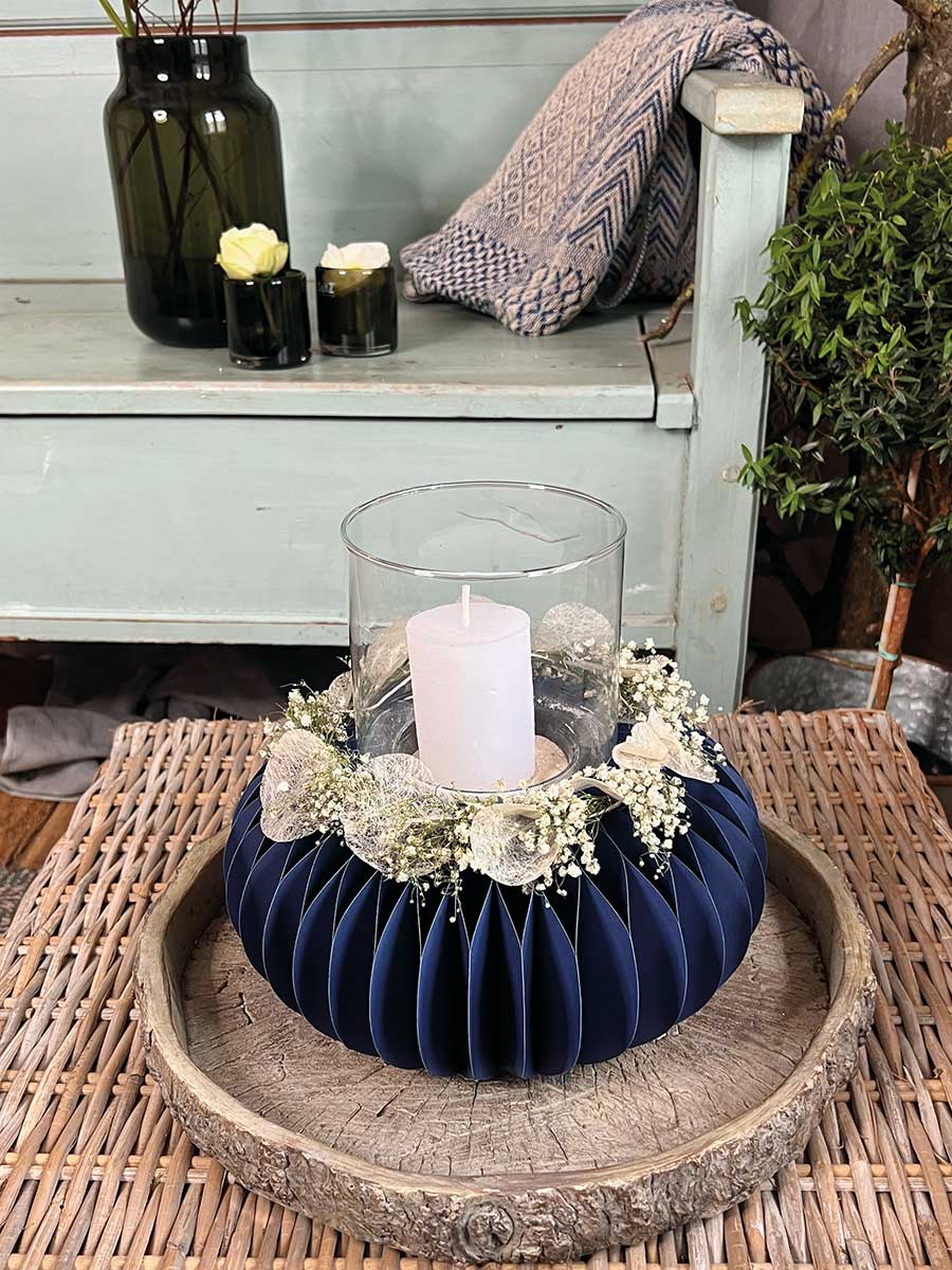 Zauberhafter Papier Faltkranz Dacia mit Magnetverschluß in blau. Die Kränze lassen sich wunderbar jahreszeitlich unterschiedlich dekorieren. Zur Lagerung lassen sie sich platzsparend zusammenfalten. Toll in Kombination mit dem Glaseinsatz Lirea - 3226