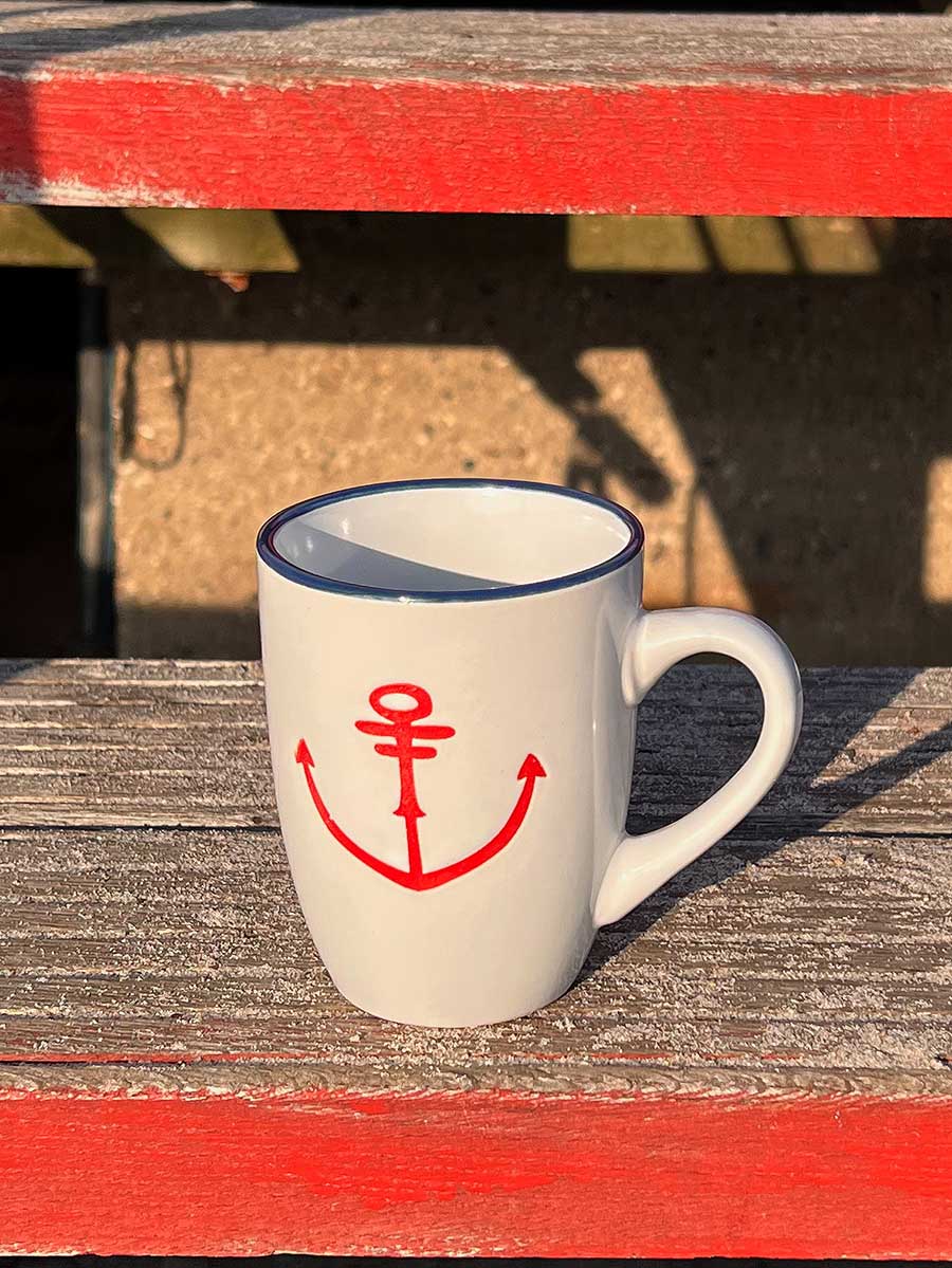 Hübscher maritimer Kaffeebecher mit rotem Anker und blauem Rand, schwere Porzellanqualität mit Henkel. Ein toller Becher mit schlicht elegantem Design. Der rote Anker ist eingebrannt.