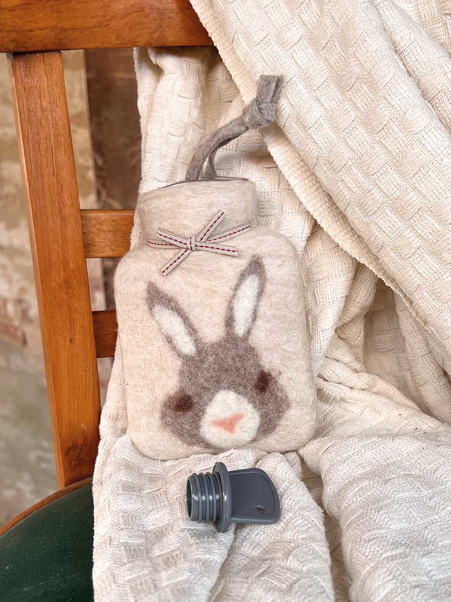 Dorothee Lehnen Miniwärmflasche Bunny Hase peyote cashmere Hülle Merinowolle gefilzt 0,2l