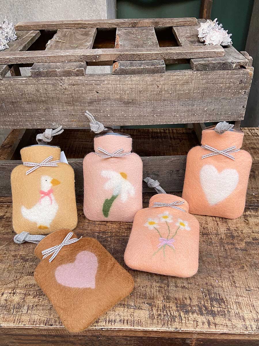 Dorothee Lehnen Miniwärmflasche Gans mit Schleife apricot Hülle Merinowolle gefilzt 0,2l