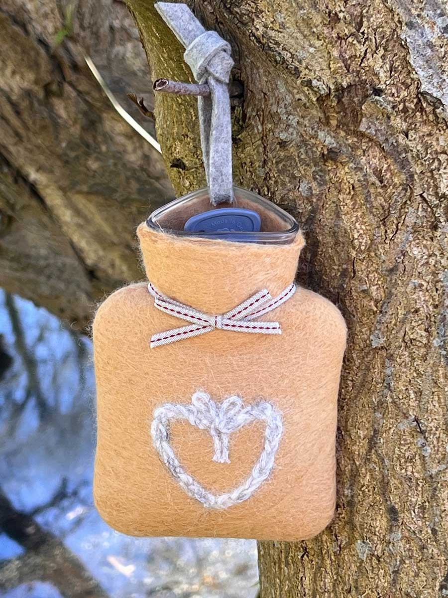 Dorothee Lehnen Miniwärmflasche gehäkeltes Herz apricot Hülle Merinowolle gefilzt 0,2l