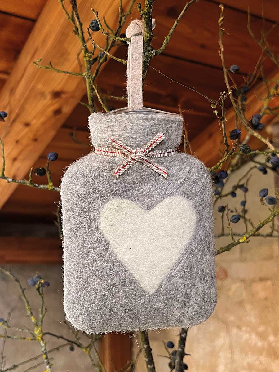 Dorothee Lehnen Miniwärmflasche Herz cashmere beige melange Hülle Merinowolle gefilzt 0,2l
