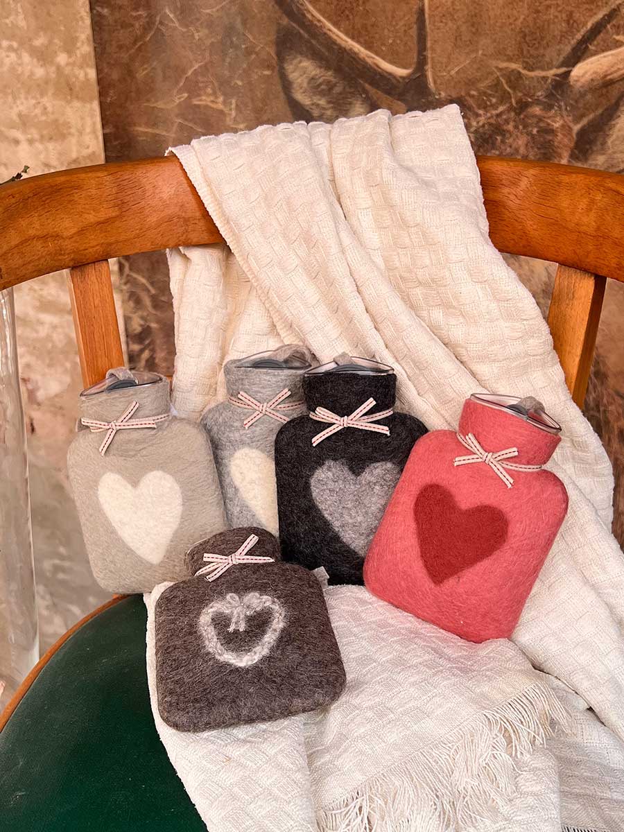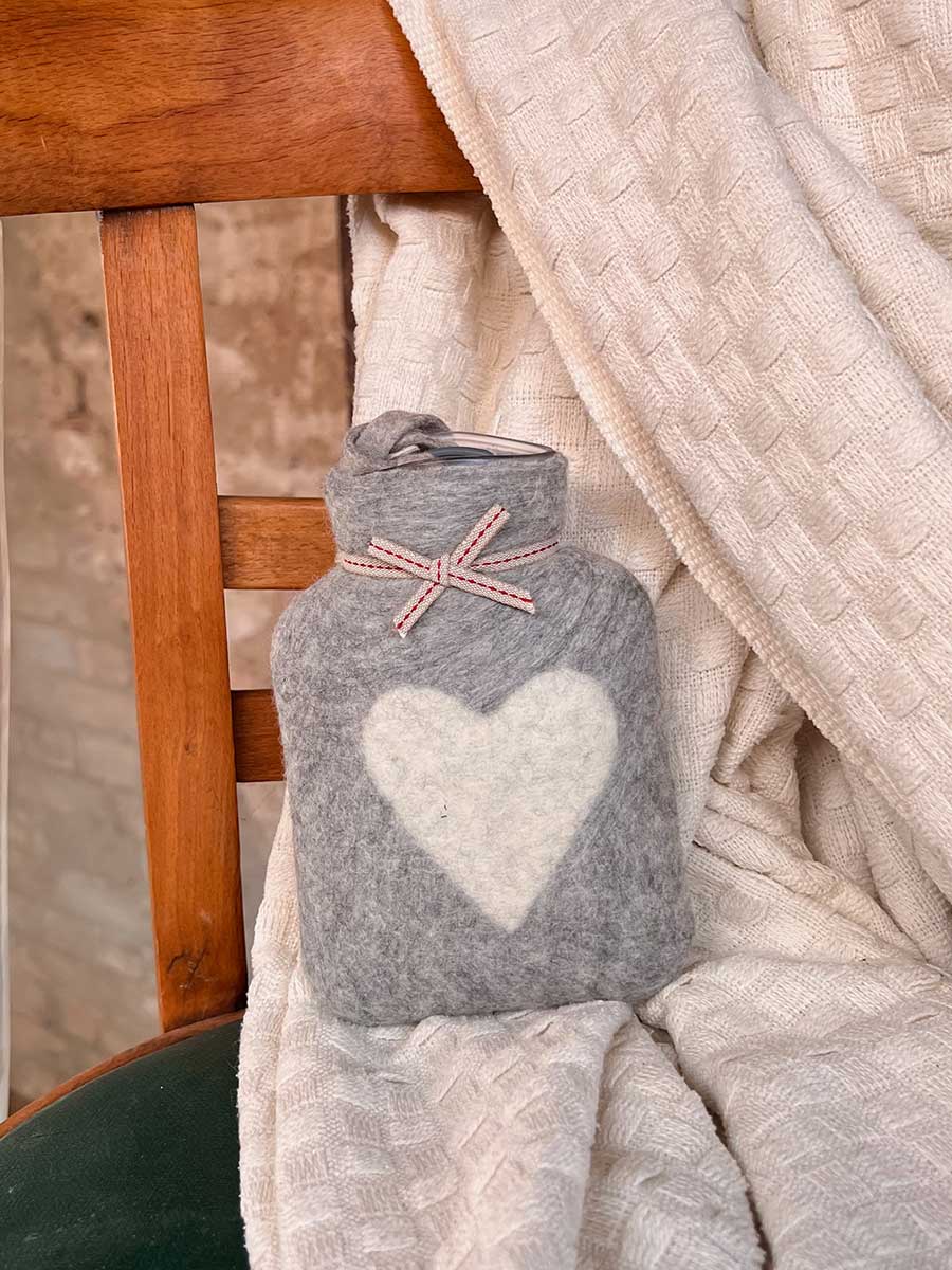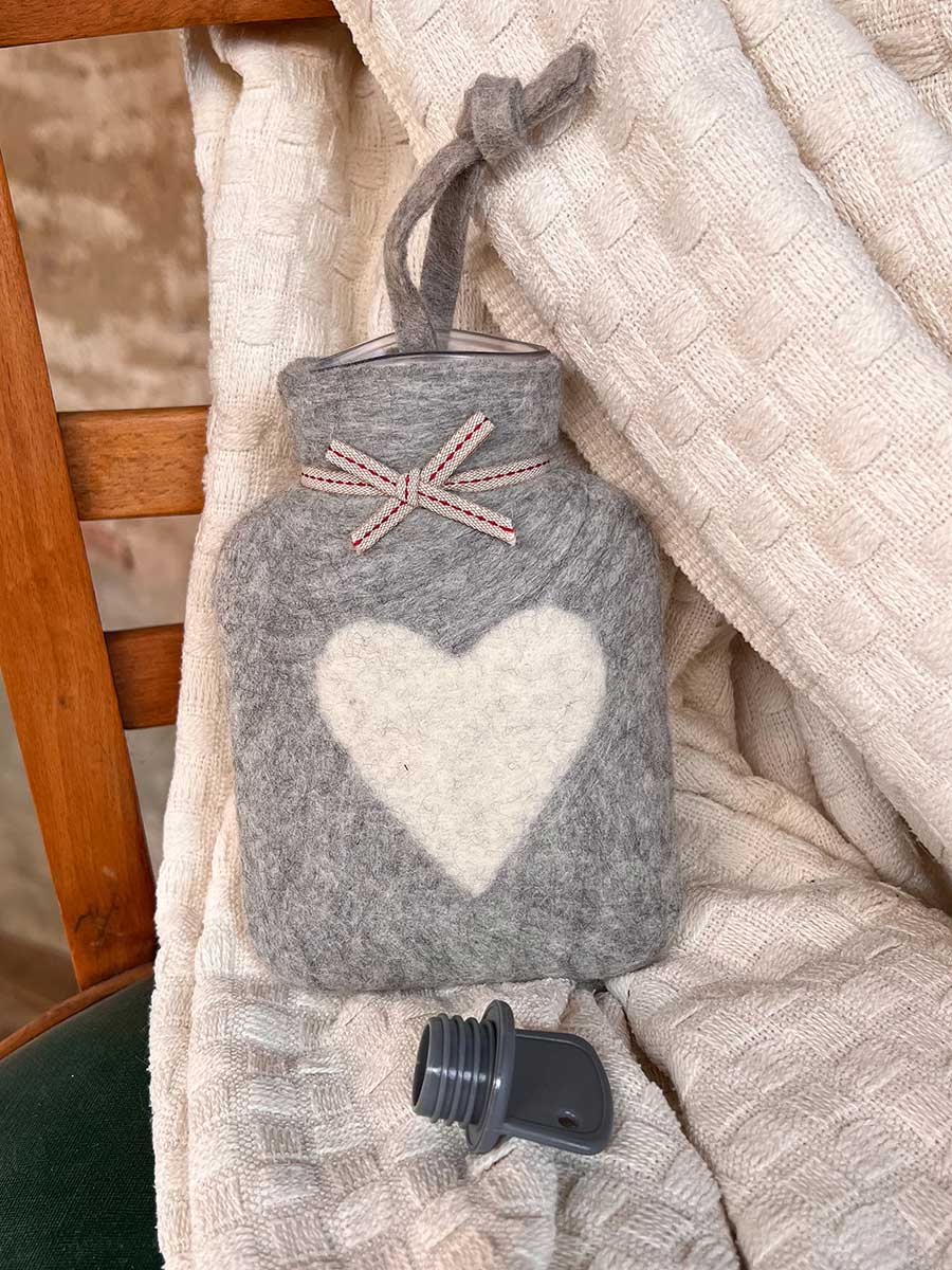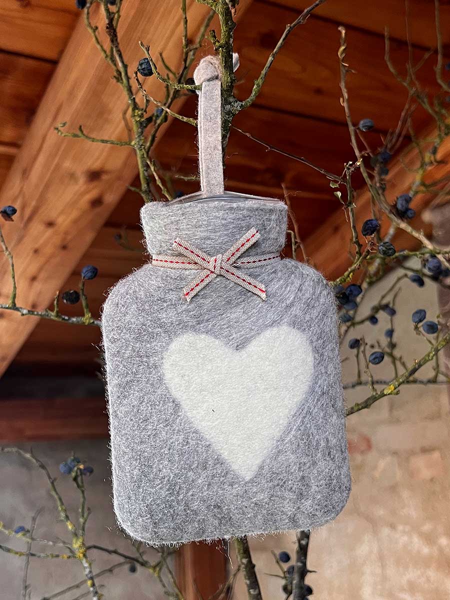 Dorothee Lehnen Miniwärmflasche Herz hellgrau meliert weiß Hülle Merinowolle gefilzt 0,2l