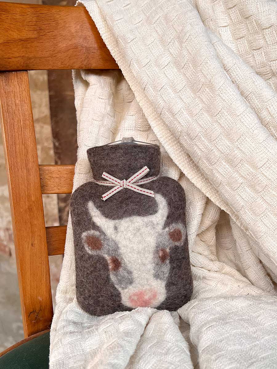 Zauberhafte Miniwärmflasche aus dem Atelier dorotheelehnen Motiv: Kuh. Das handliche Format eignet sich auch für unterwegs und findet prima in der Jackentasche Platz. Die Produkte von Dorothee Lehnen sind einzigartig und jede Wärmflasche ist ein handgefertigtes Kunstwerk, formschöne Behaglichkeit für ein kuscheliges Zuhause.