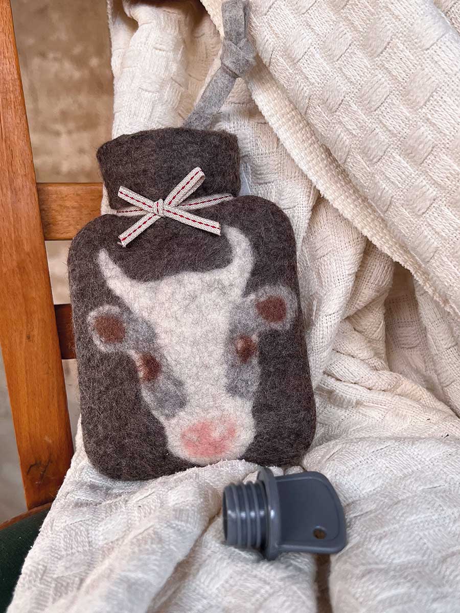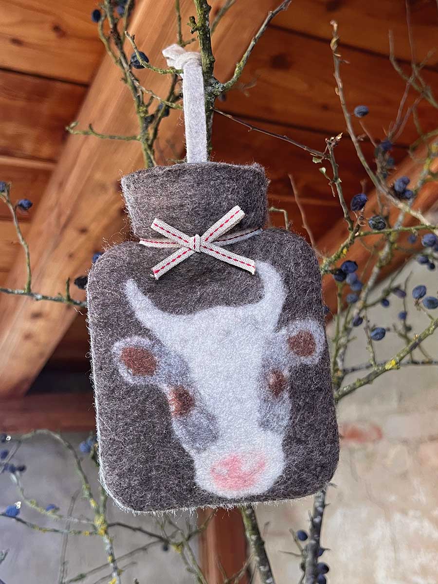 Dorothee Lehnen Miniwärmflasche Kuh caracul Hülle Merinowolle gefilzt 0,2l