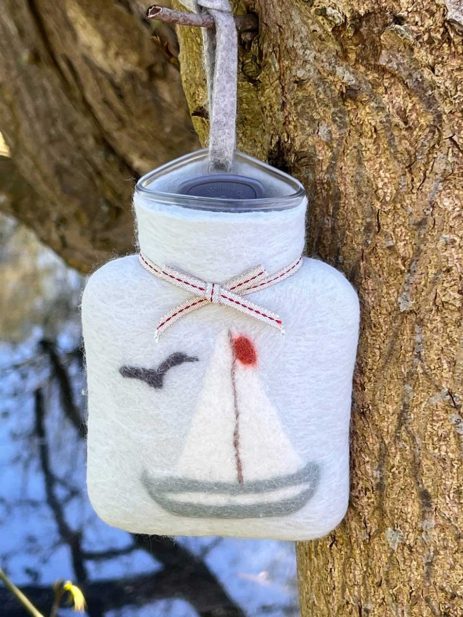 Dorothee Lehnen Miniwärmflasche Segelboot silver birch Hülle Merinowolle gefilzt 0,2l