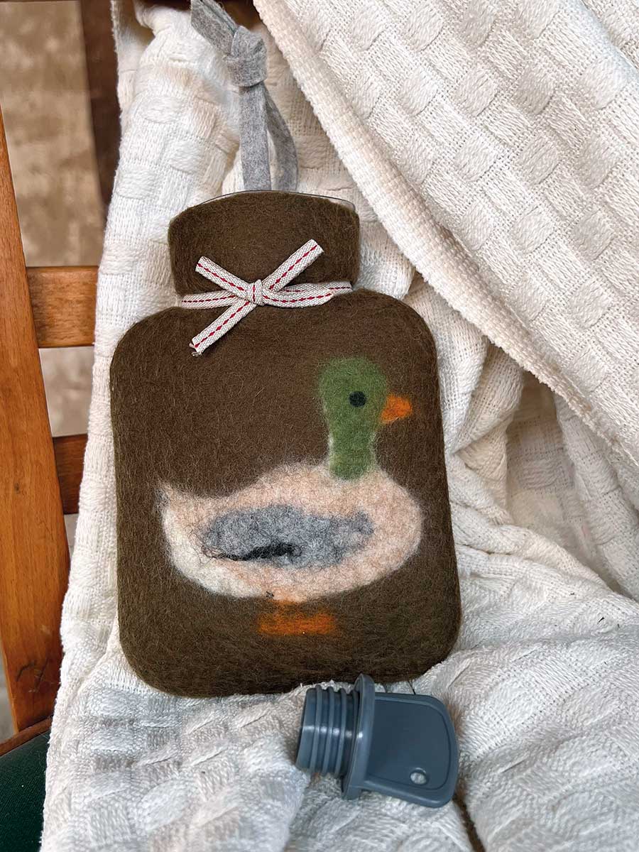 Zauberhafte Miniwärmflasche aus dem Atelier dorotheelehnen Motiv: Stockente. Das handliche Format eignet sich auch für unterwegs und findet prima in der Jackentasche Platz. Die Produkte von Dorothee Lehnen sind einzigartig und jede Wärmflasche ist ein handgefertigtes Kunstwerk, formschöne Behaglichkeit für ein kuscheliges Zuhause.