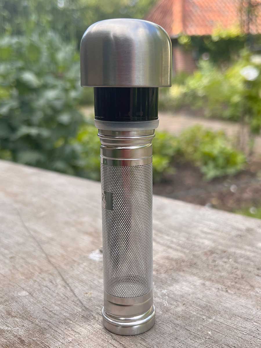 Mit dem praktischen Siebeinsatz als Zubehör lassen sich Tee, Kräuter oder Obststückchen in die Isolier-Flaschen von Qwetch schrauben. Der kurze Einsatz ist kompatibel für Flaschen mit 260 - 500ml.