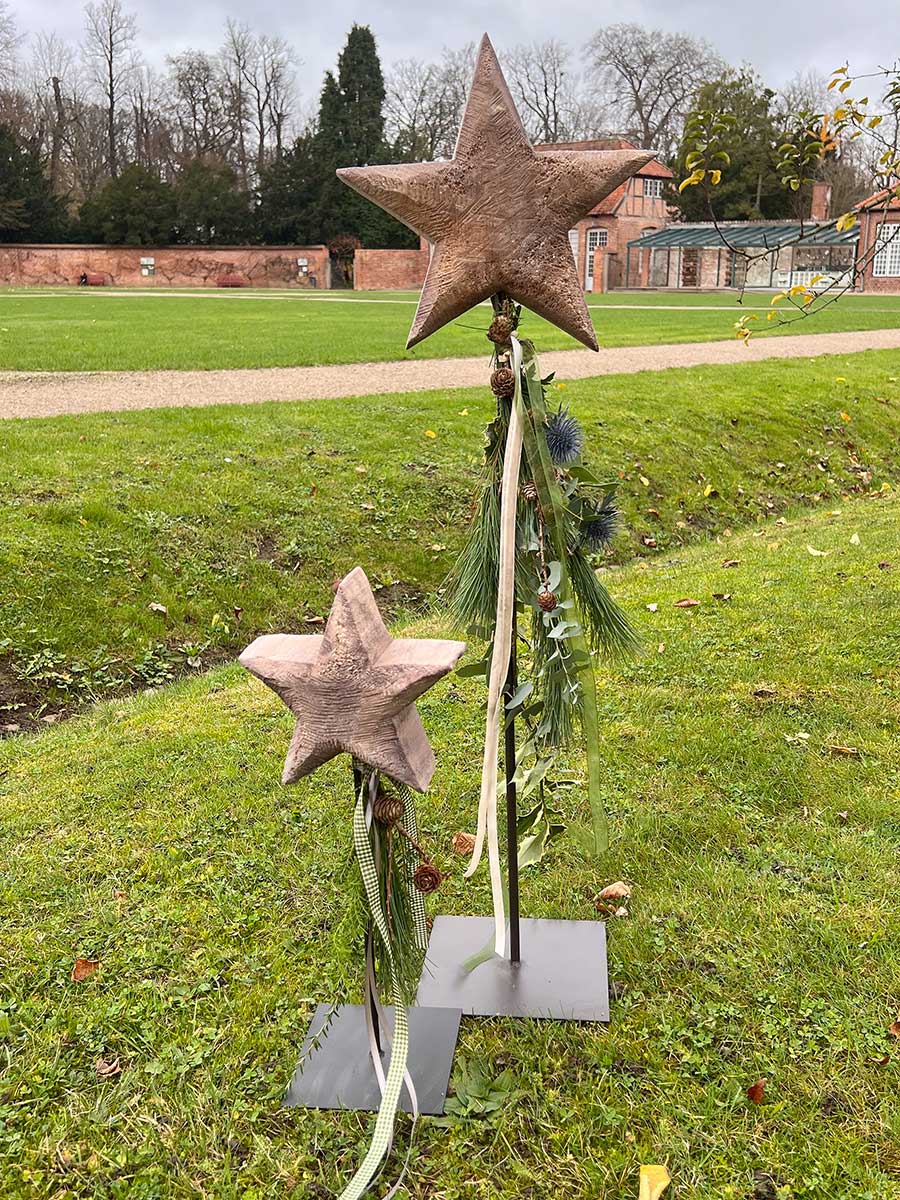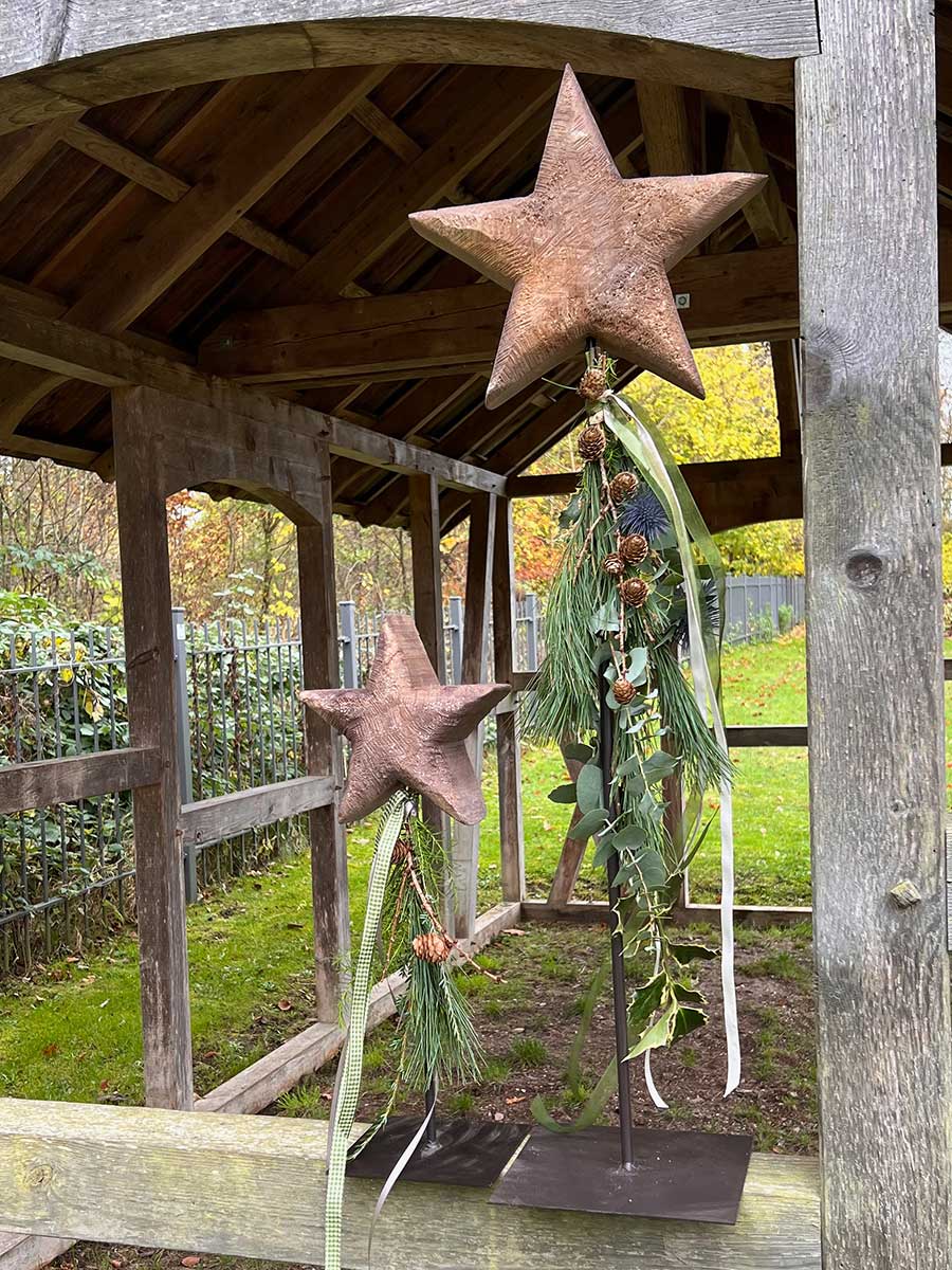 Lieferumfang: 1 WMG Holz - Stern graubraun Pappel gesägt auf schwarzer Metallstange H50