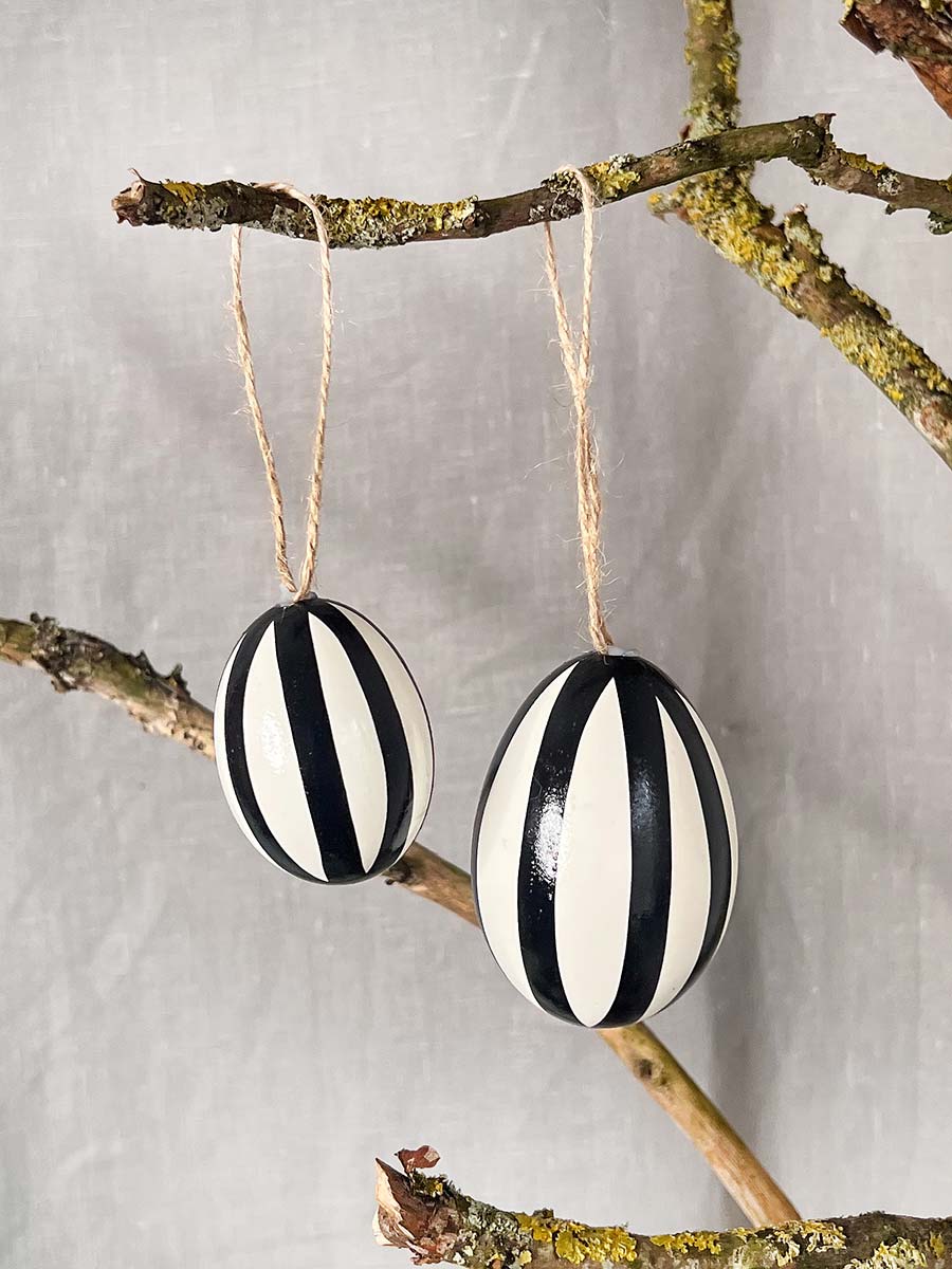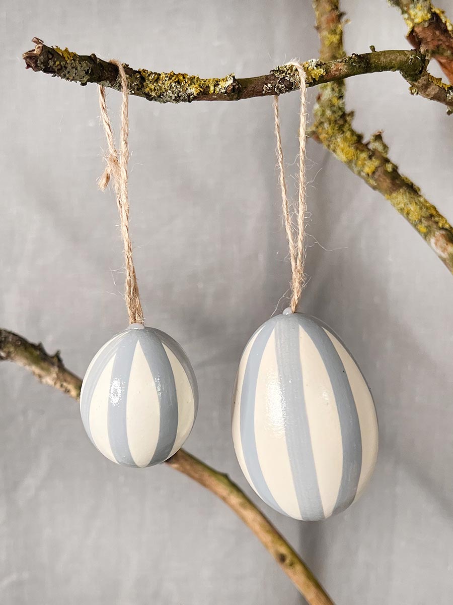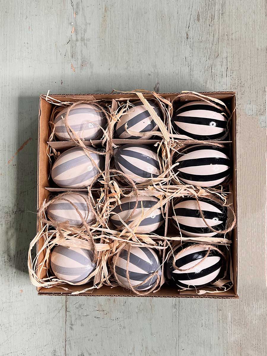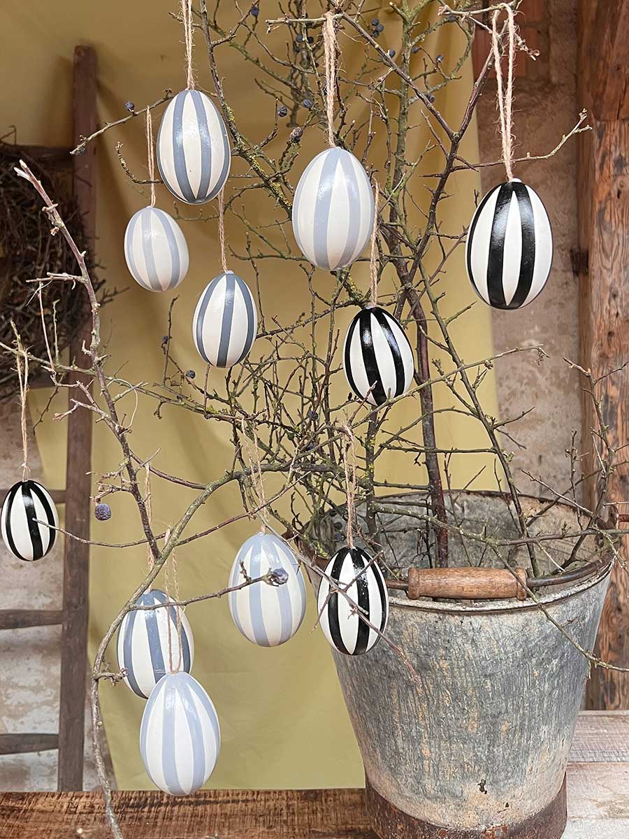 12er Pack ausgeblasene Hühnereier Stripes mit Sisalband zum Aufhängen, in 3 verschiedenen Farbabstufungen grau und schwarz