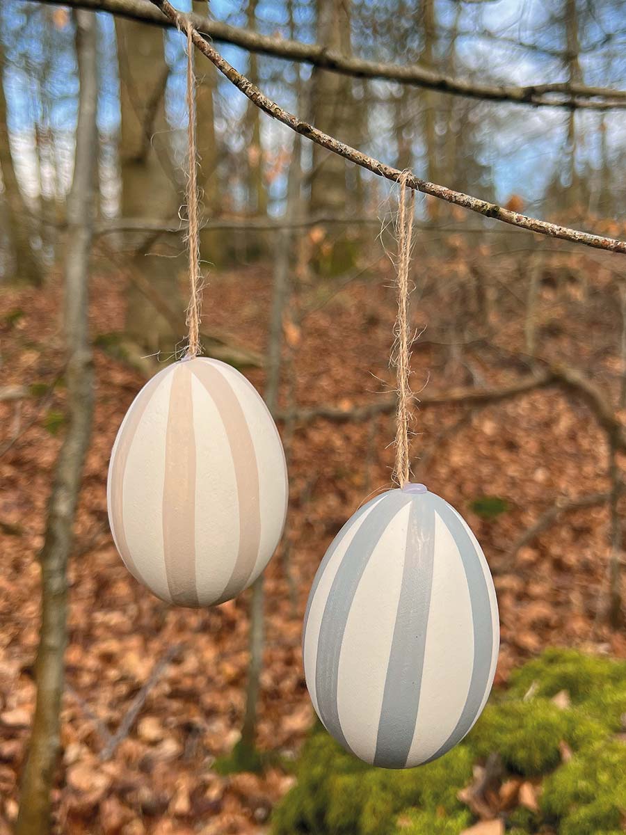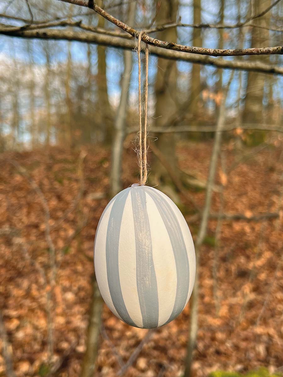 6er Pack ausgeblasene Gänseeier grau gestreift mit Sisalbändchen zum Aufhängen.