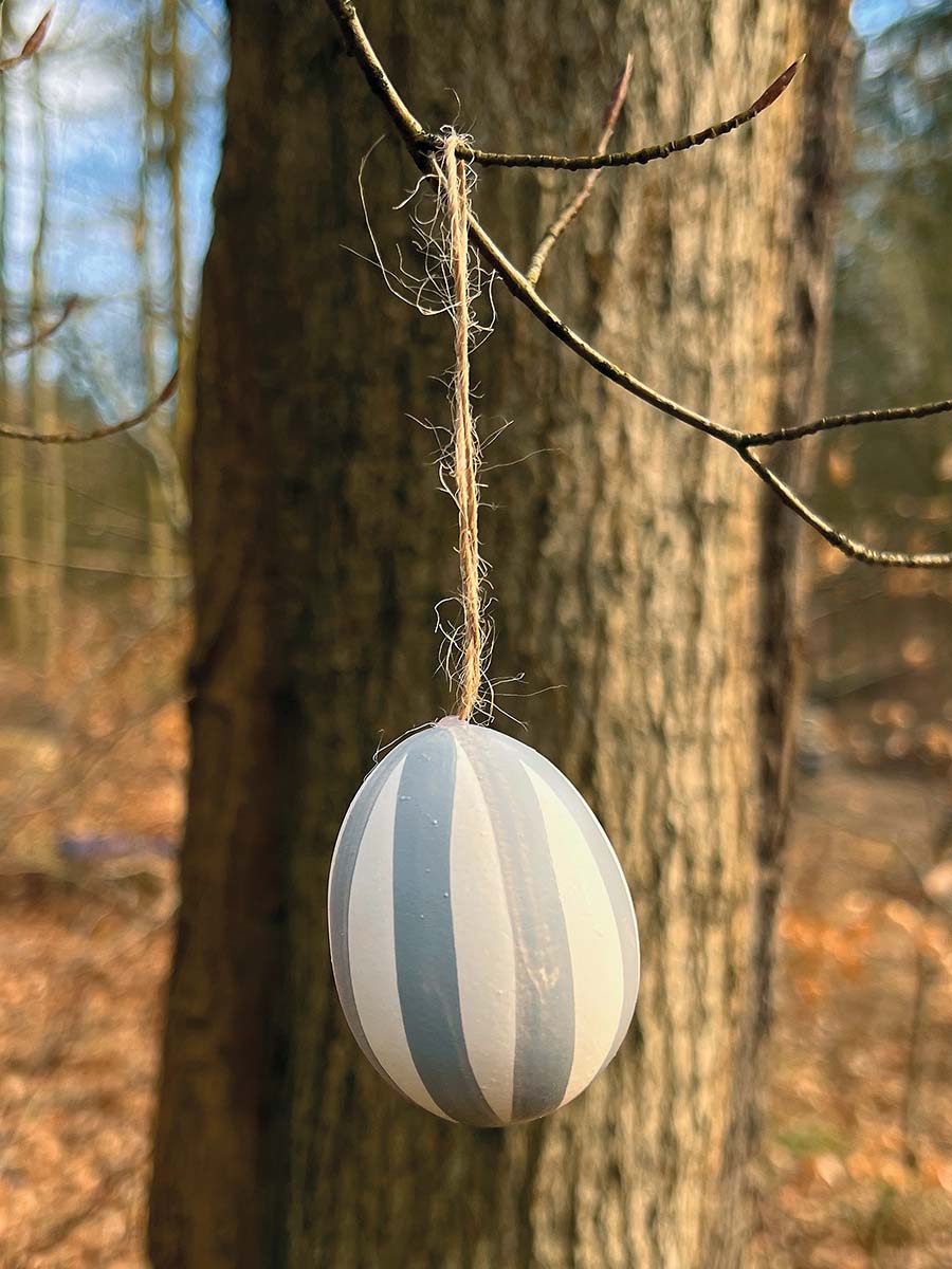 6er Pack ausgeblasene Hühnereier grau gestreift mit Sisalbändchen zum Aufhängen.