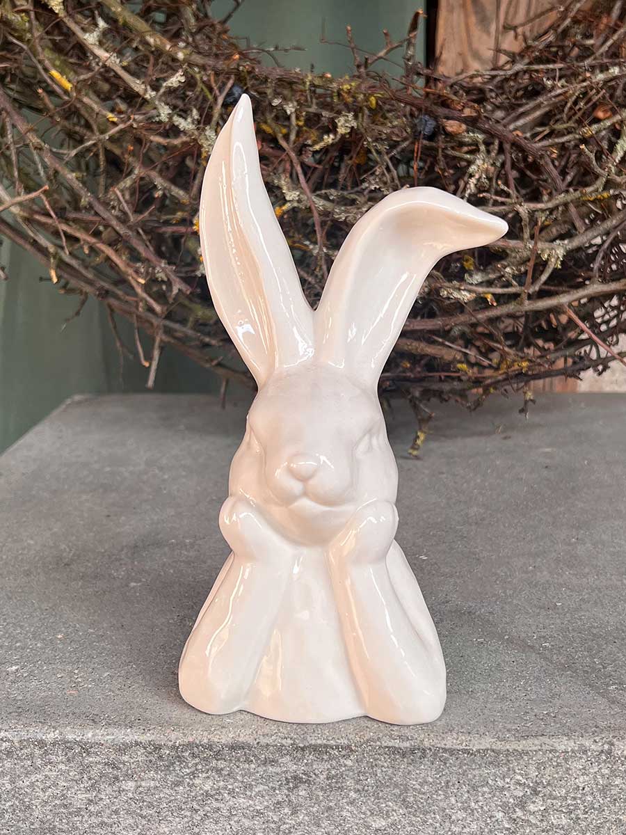 Außergewöhnliche Osterdekoration Keramik Osterhase Oberkörper Kopf auf die Pfoten aufgestützt in weiß.